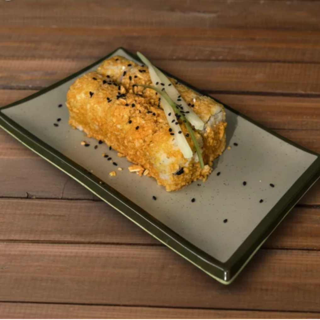 Relleno de queso crema, aguacate, camarón empanizado y cubierto de flaming hot