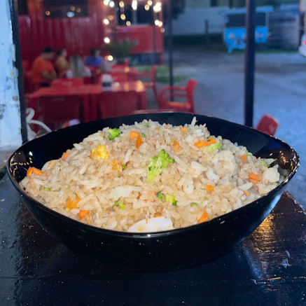 Arroz chino con trozos de carne, camarón y pollo capeado (los ingredientes van revueltos con el arroz)