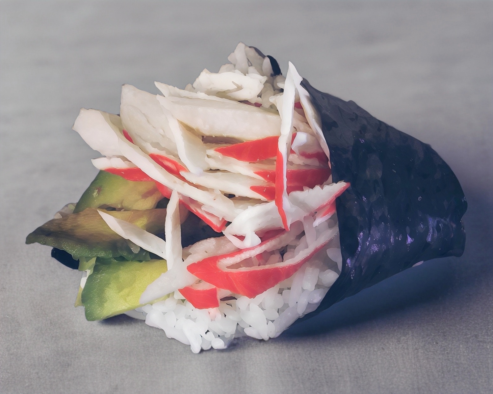Alga nori en forma de cono rellena de pepino queso crema aguacate y surimi