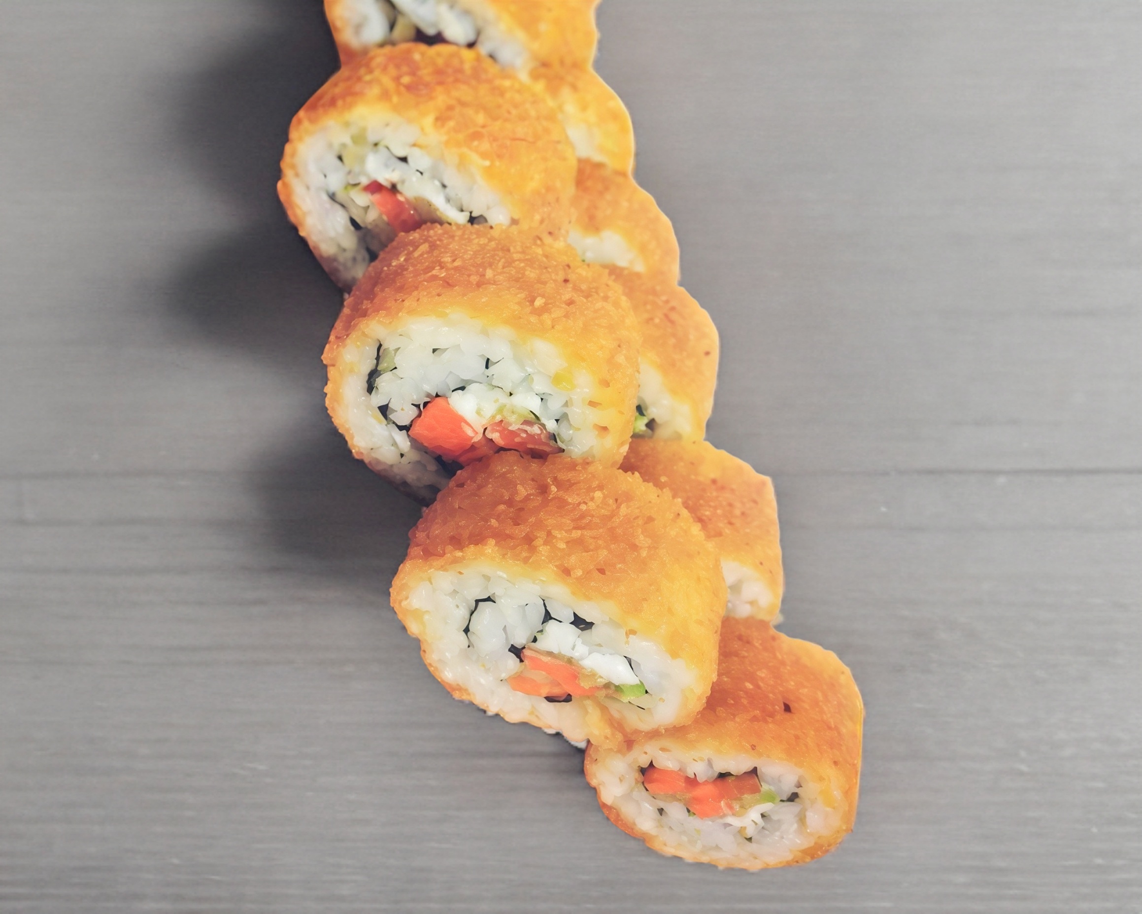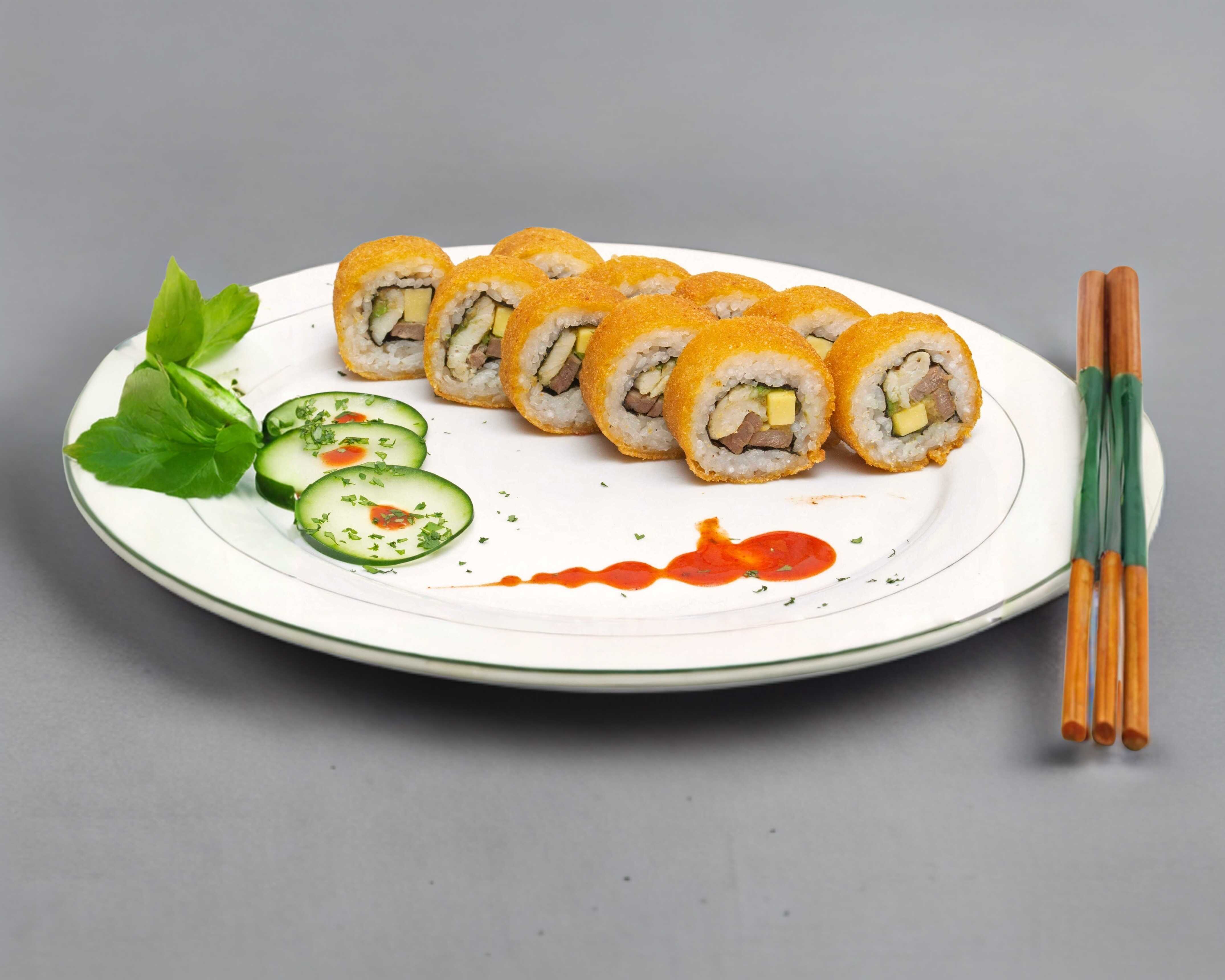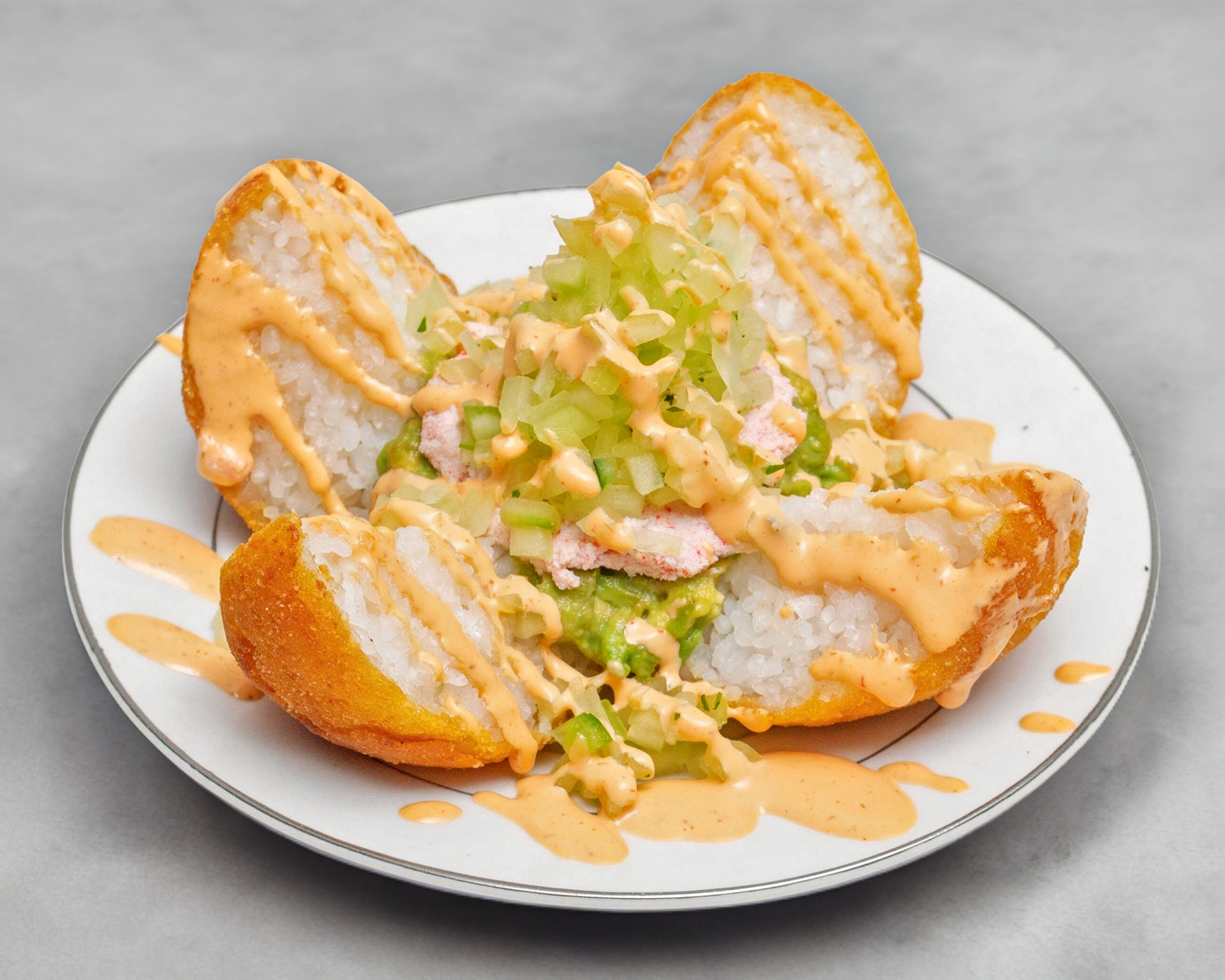 Bola de arroz empanizada , rellena de philadelphia, pepino, aguacate, tampico, salsa de Anguila, spaicy