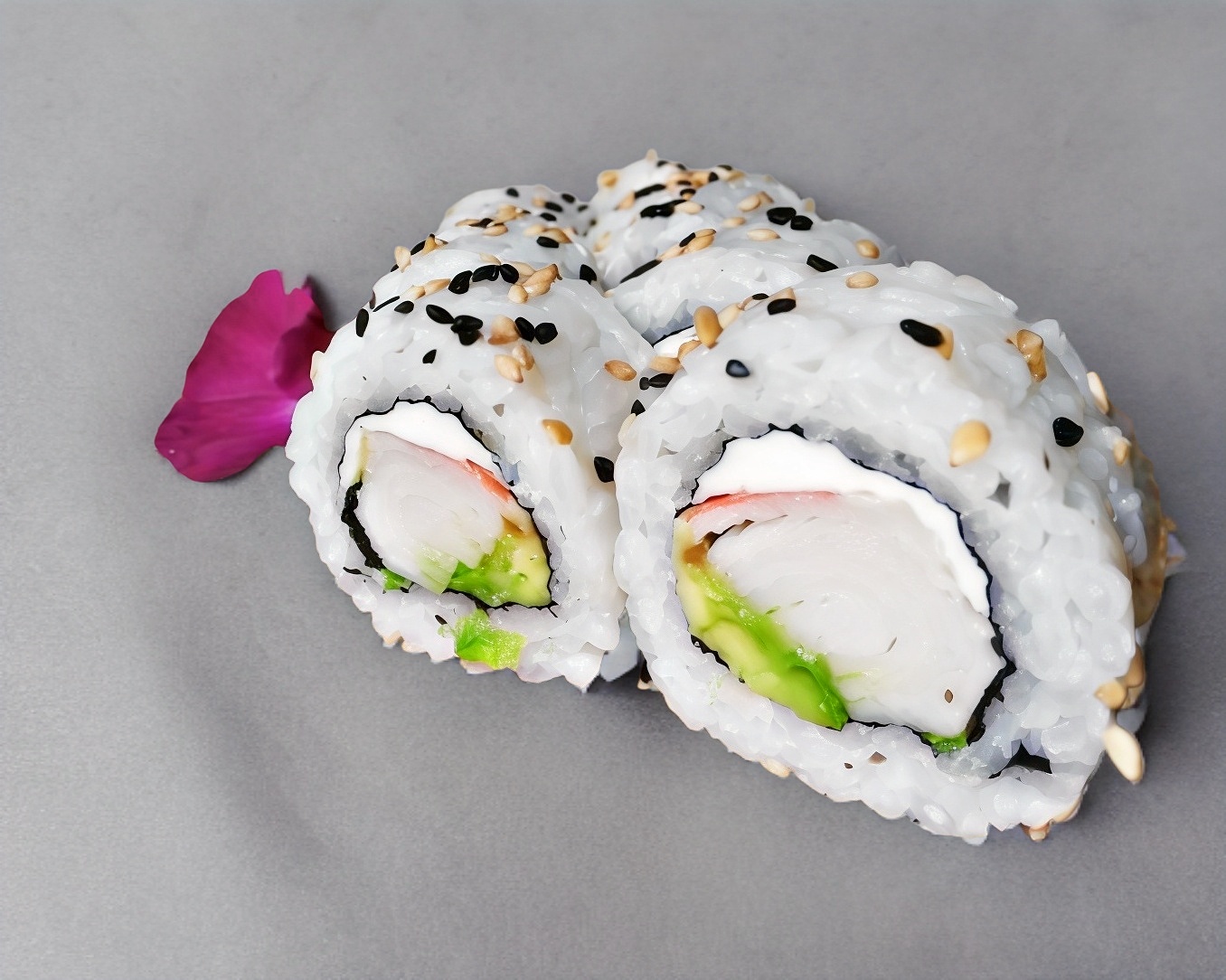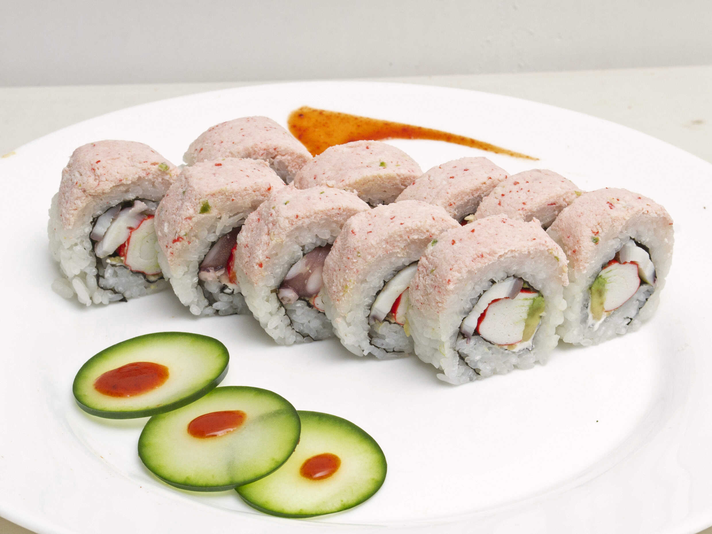 pulpo, aguacate, surimi y queso crema. por fuera tampico y furikake