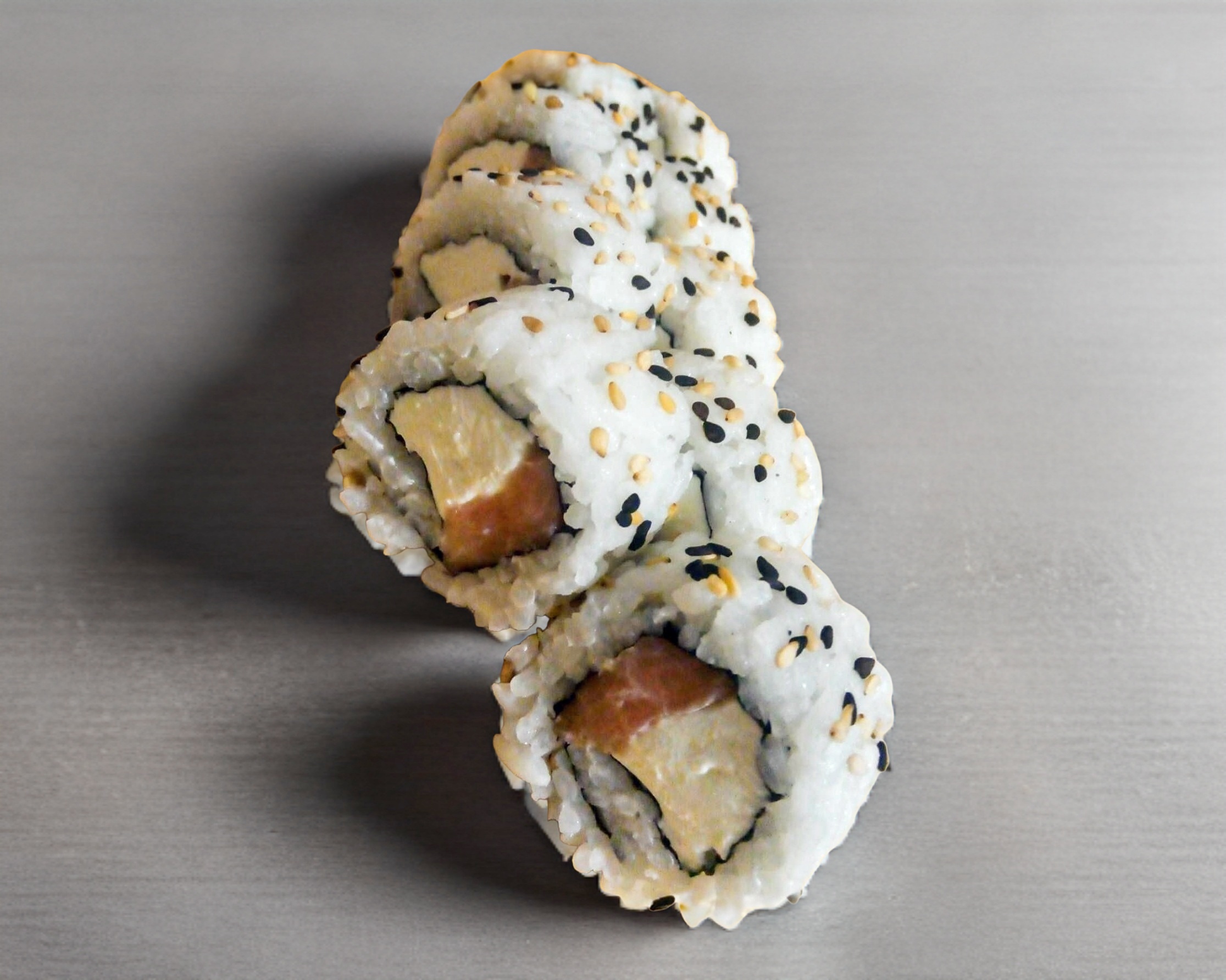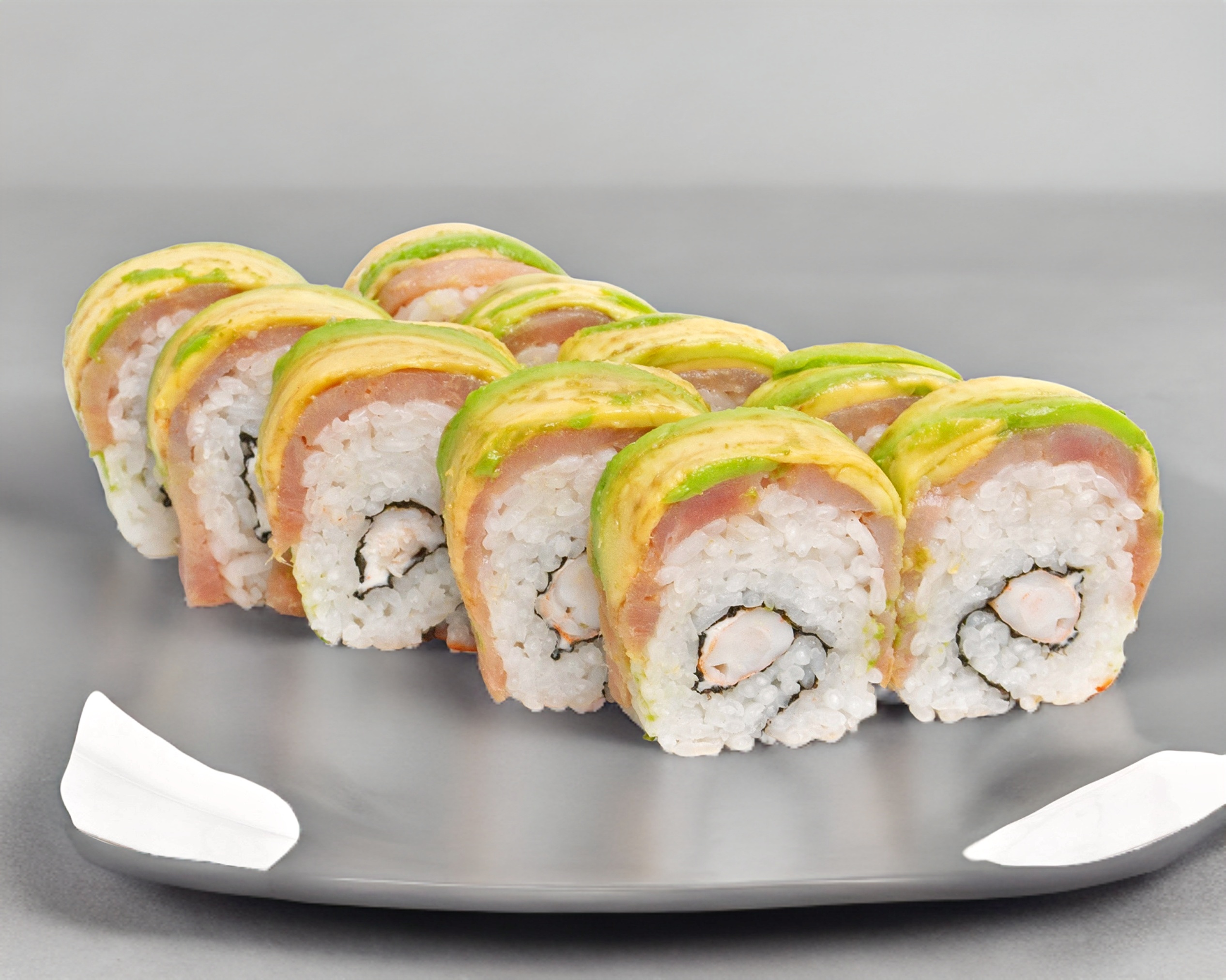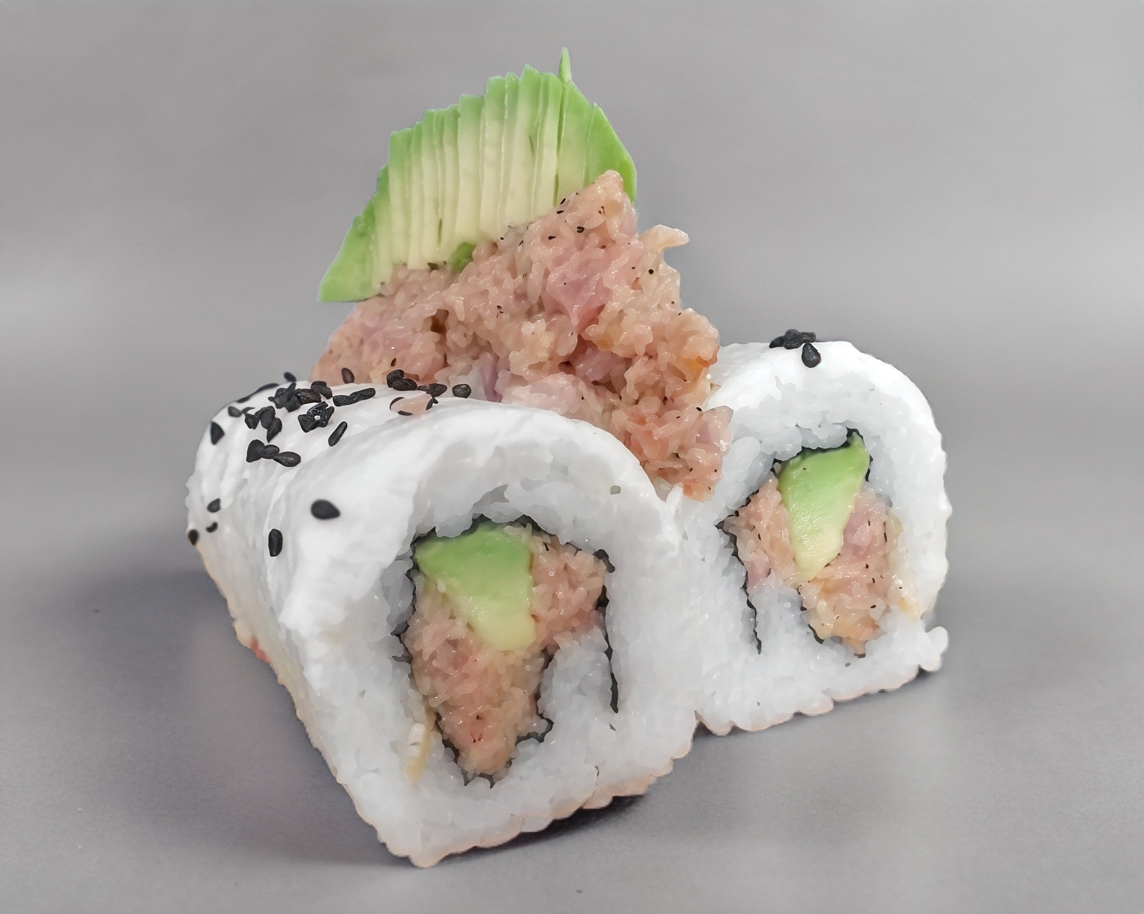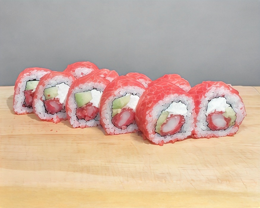 Por dentro queso crema, camarón y por fuera atún y aguacate