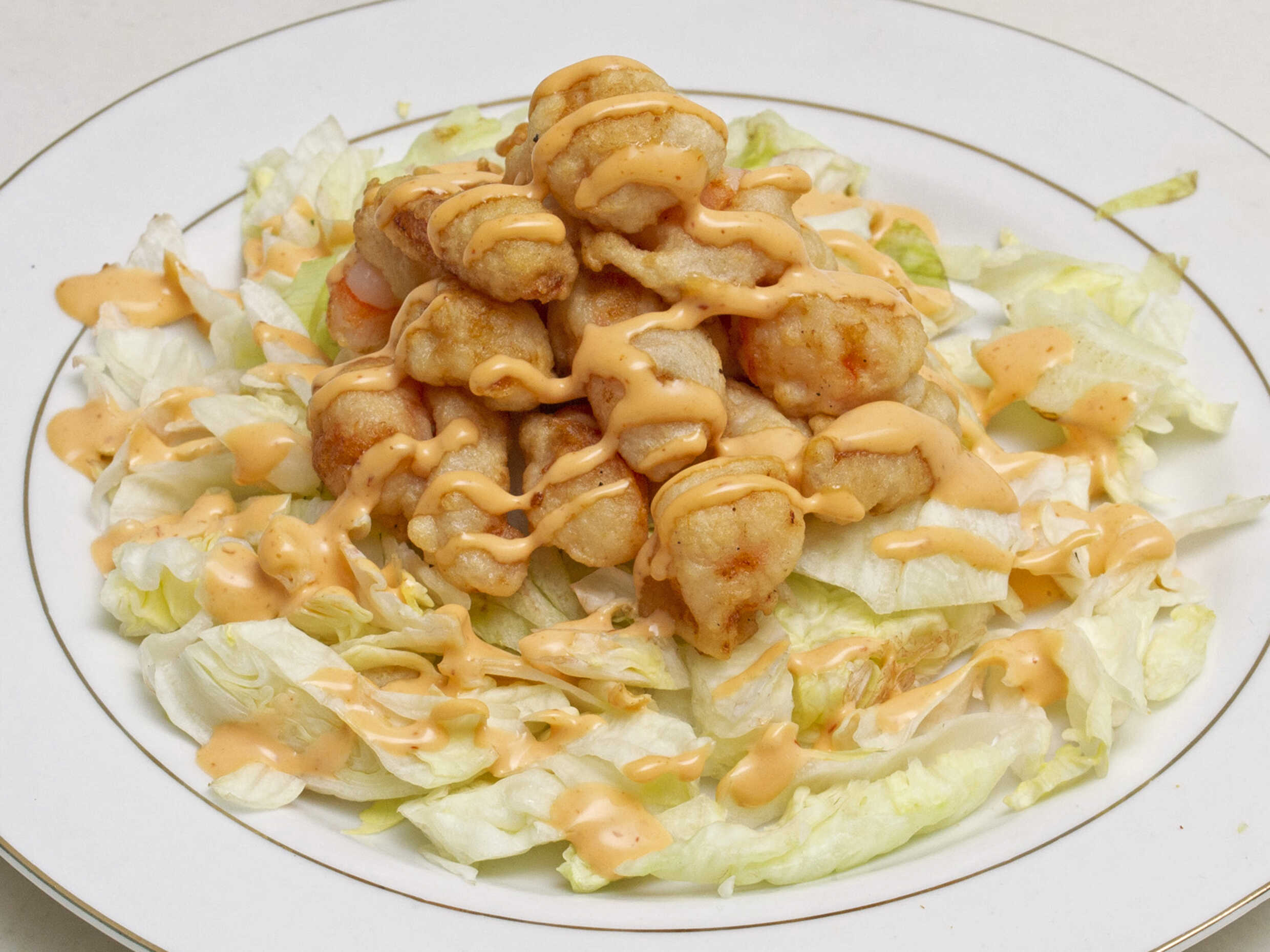 Camarones capeados sobre una cama de lechuga con salsa spaicy