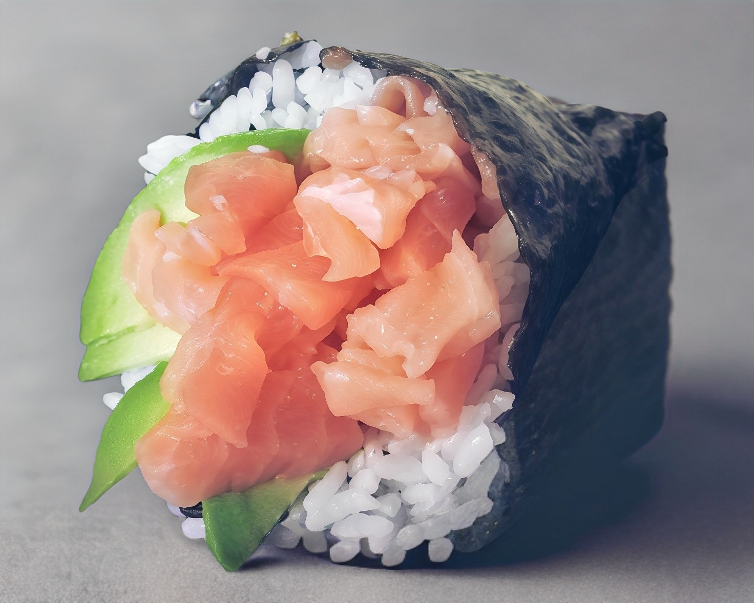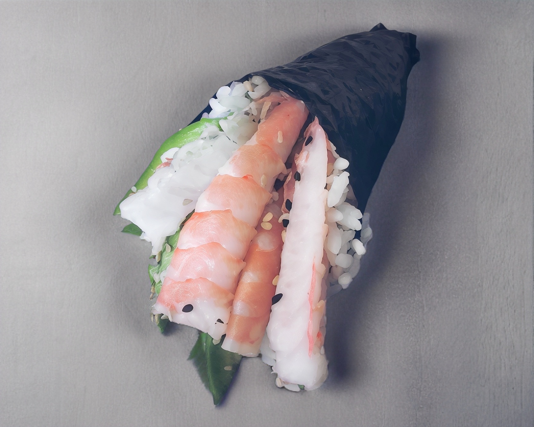 Alta nori en forma d cono rellena de pepino, queso crema, aguacate y salmón