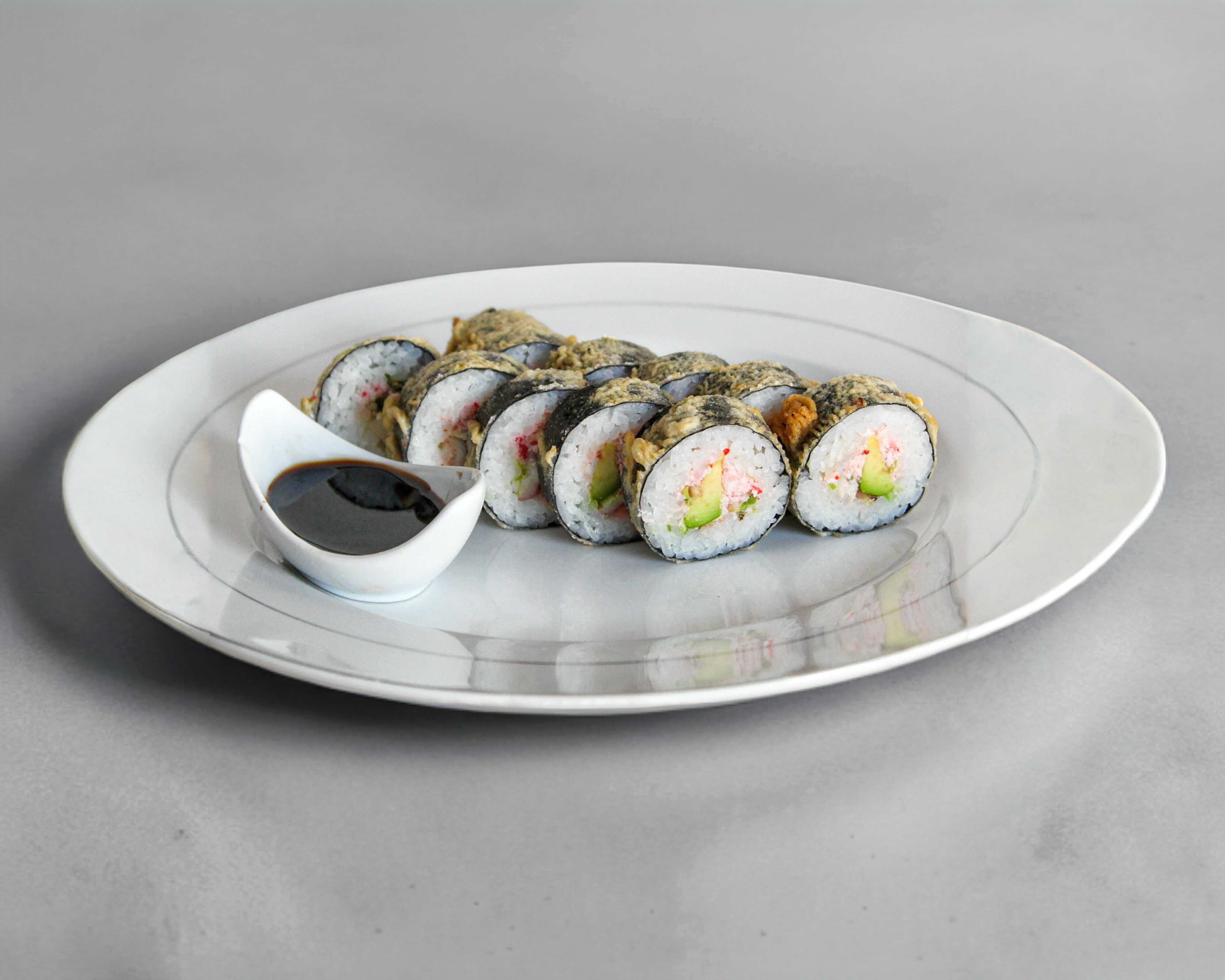 Camarón, pepino, aguacate, queso crema por dentro y por fuera pasta Tampico y Chipotle.