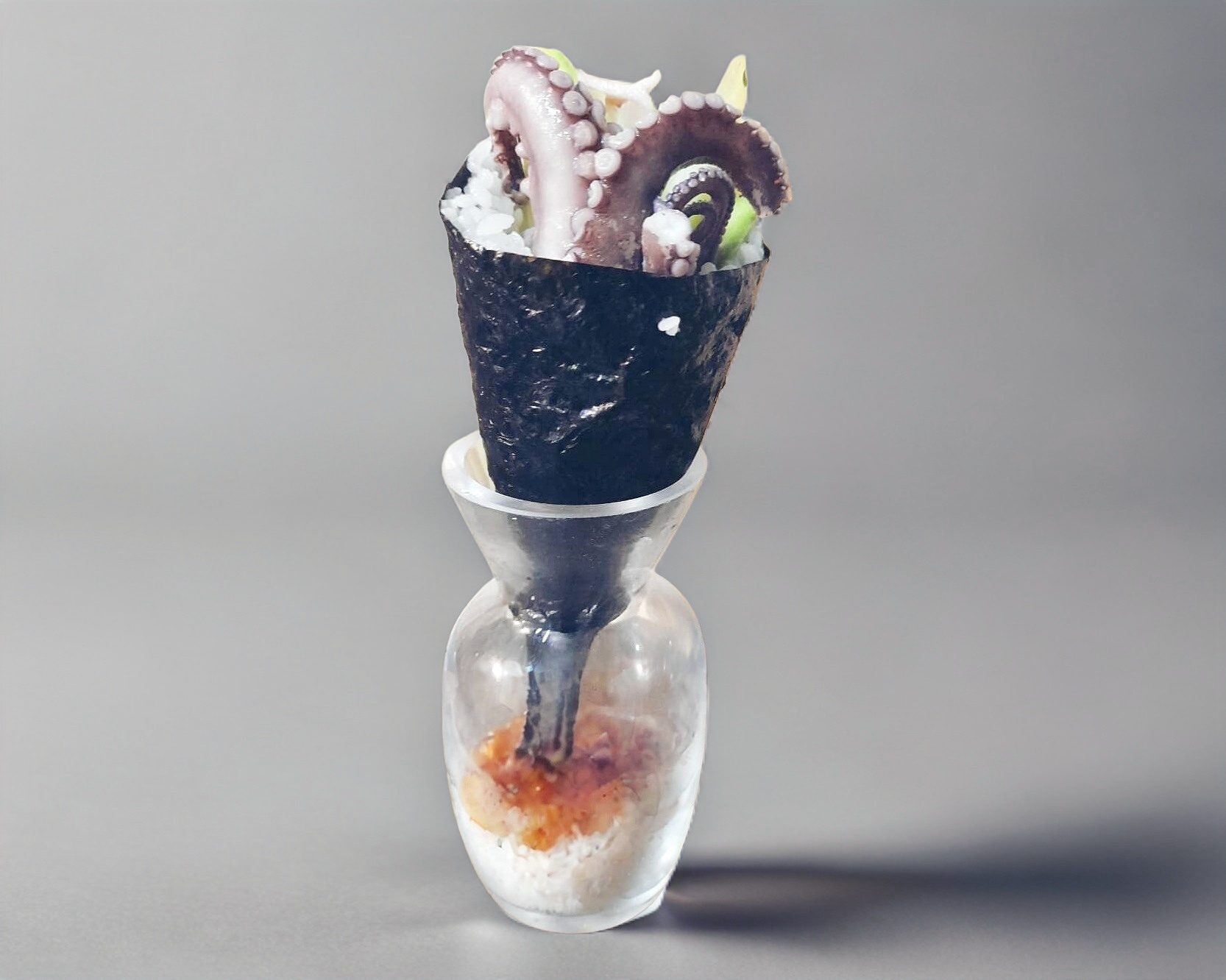 Alga nori en forma de cono rellena de pepino queso crema aguacate y pulpo
