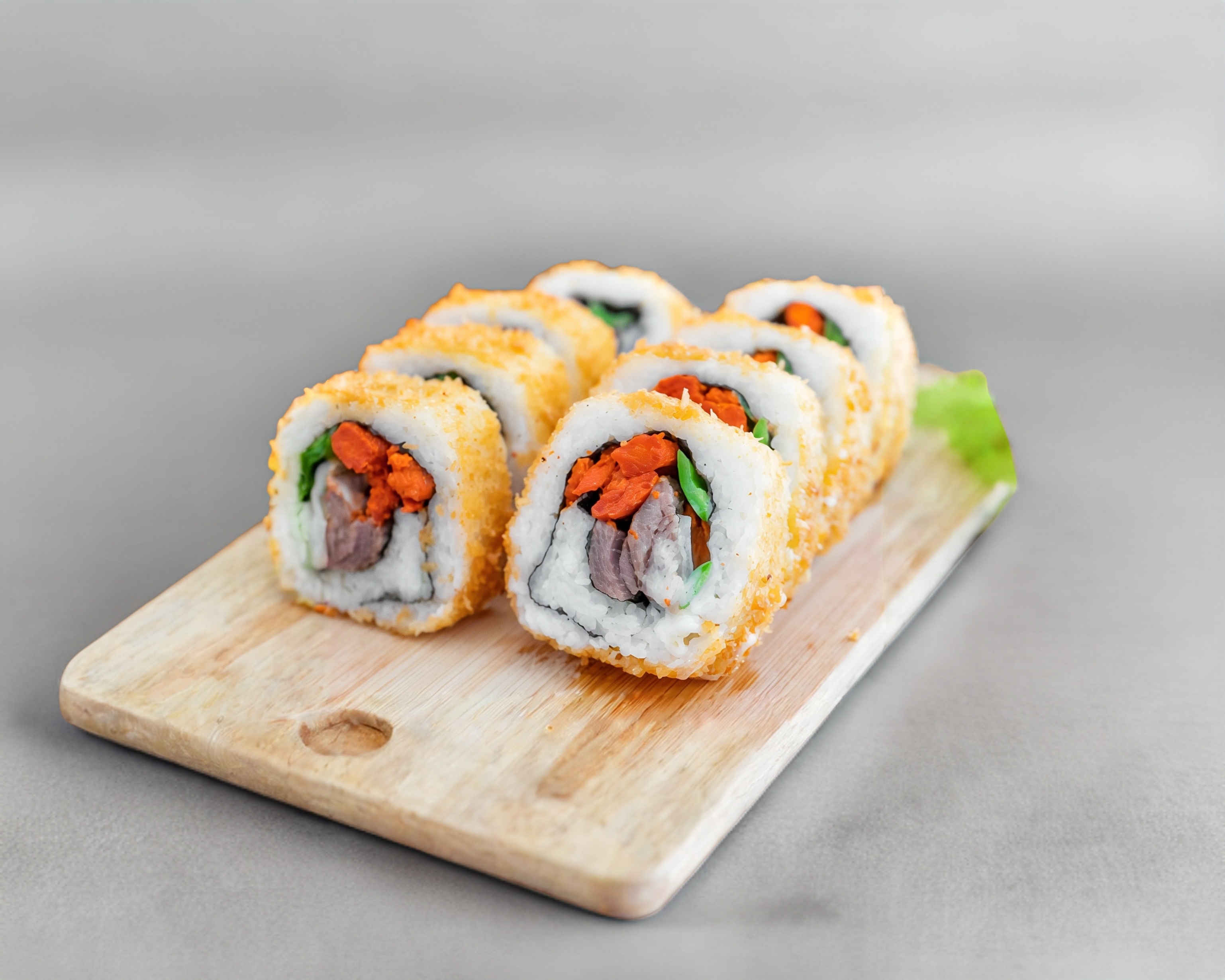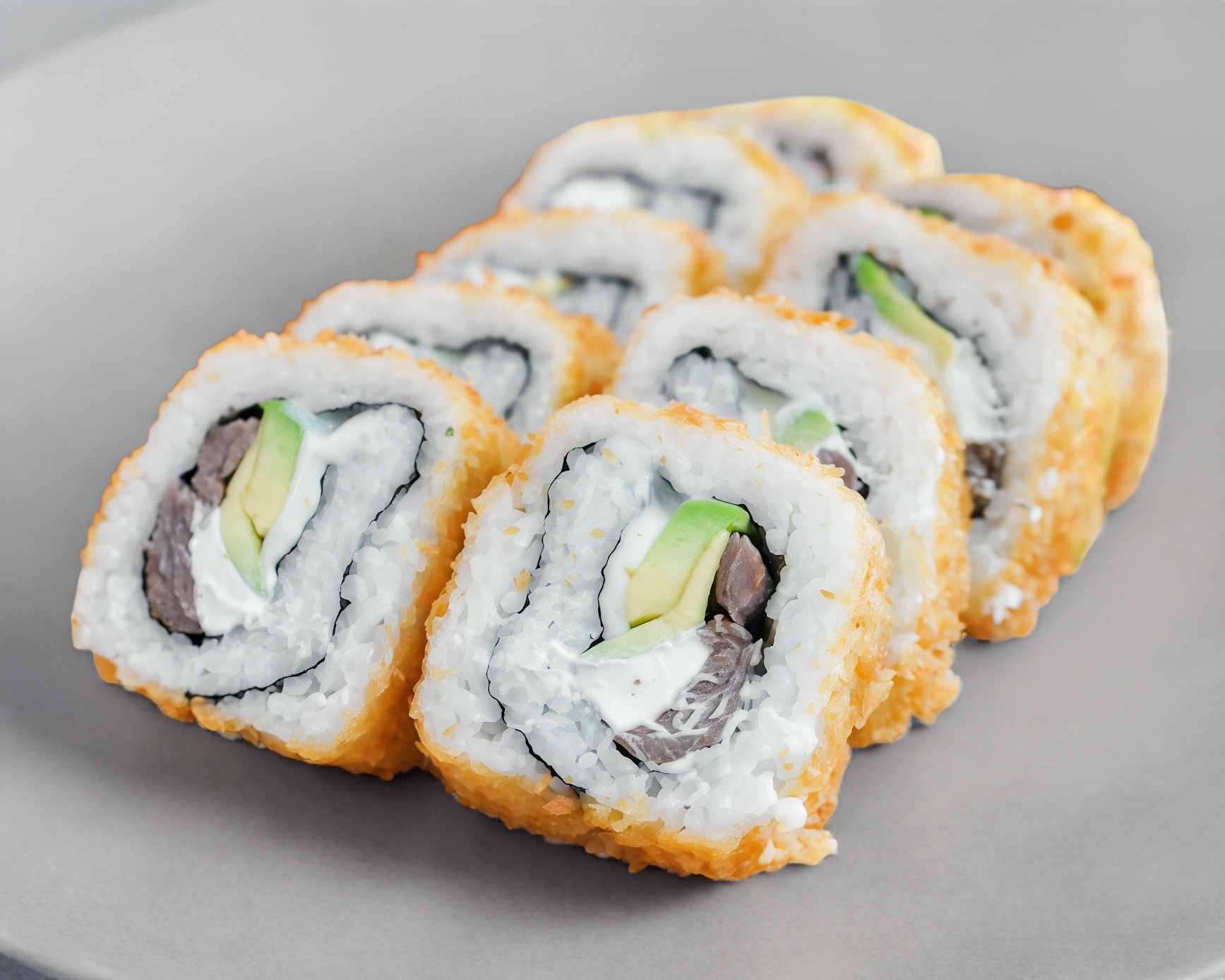 Rollo caliente de arrachera, con aguacate, philadelphia y queso manchego. Acompañado de salsa de soya y aderezo chipotle.