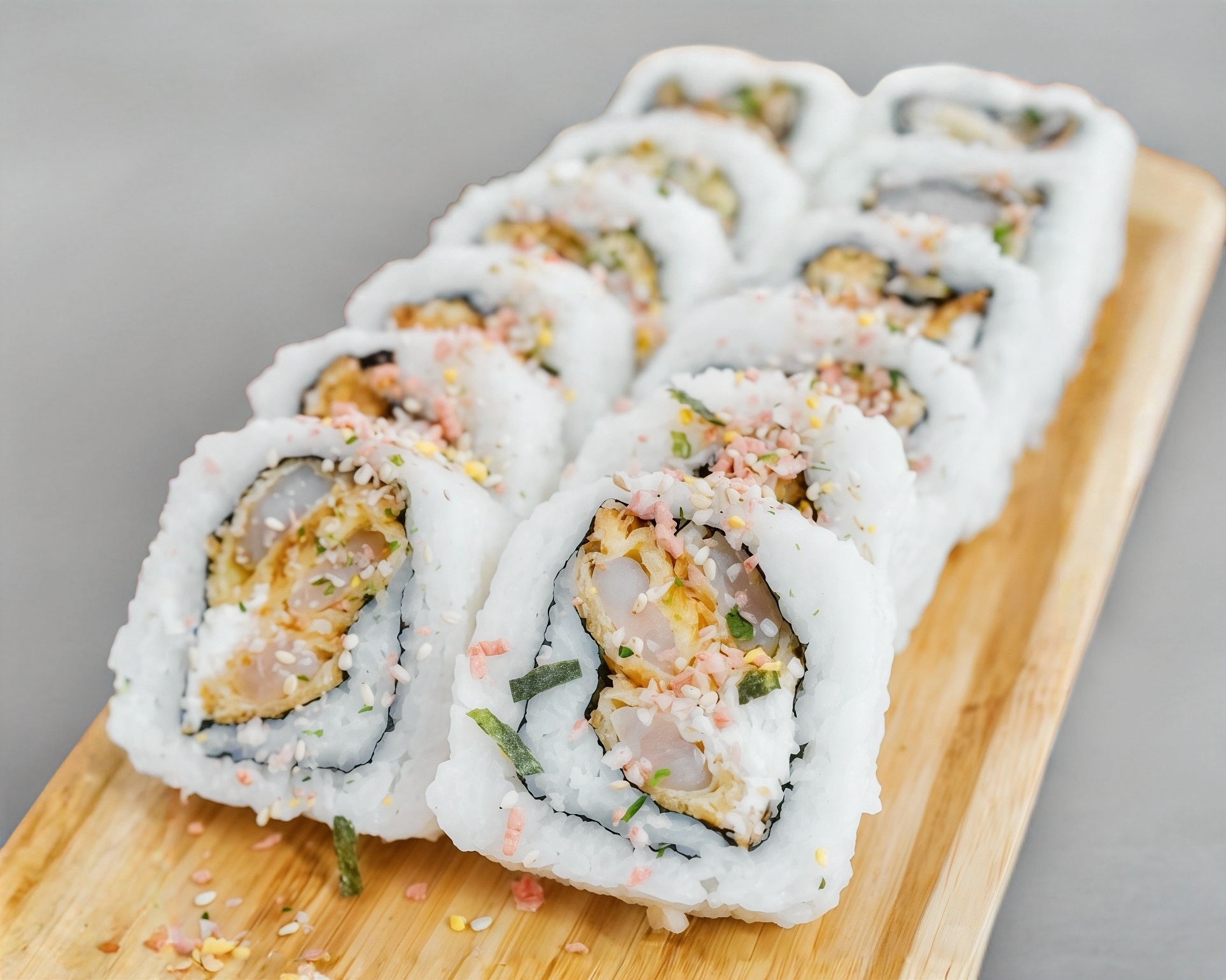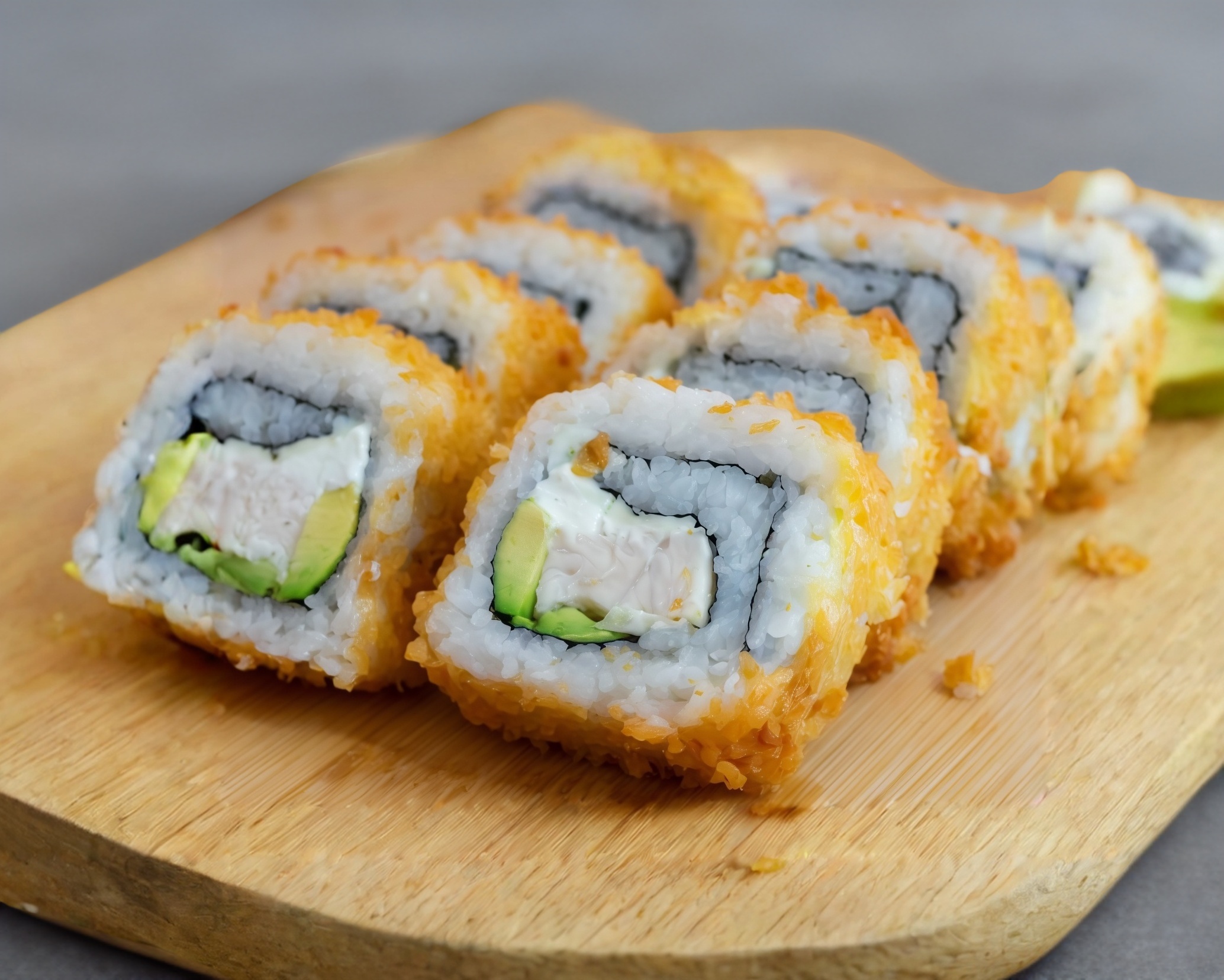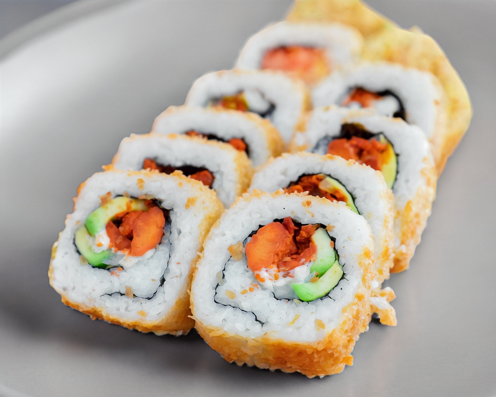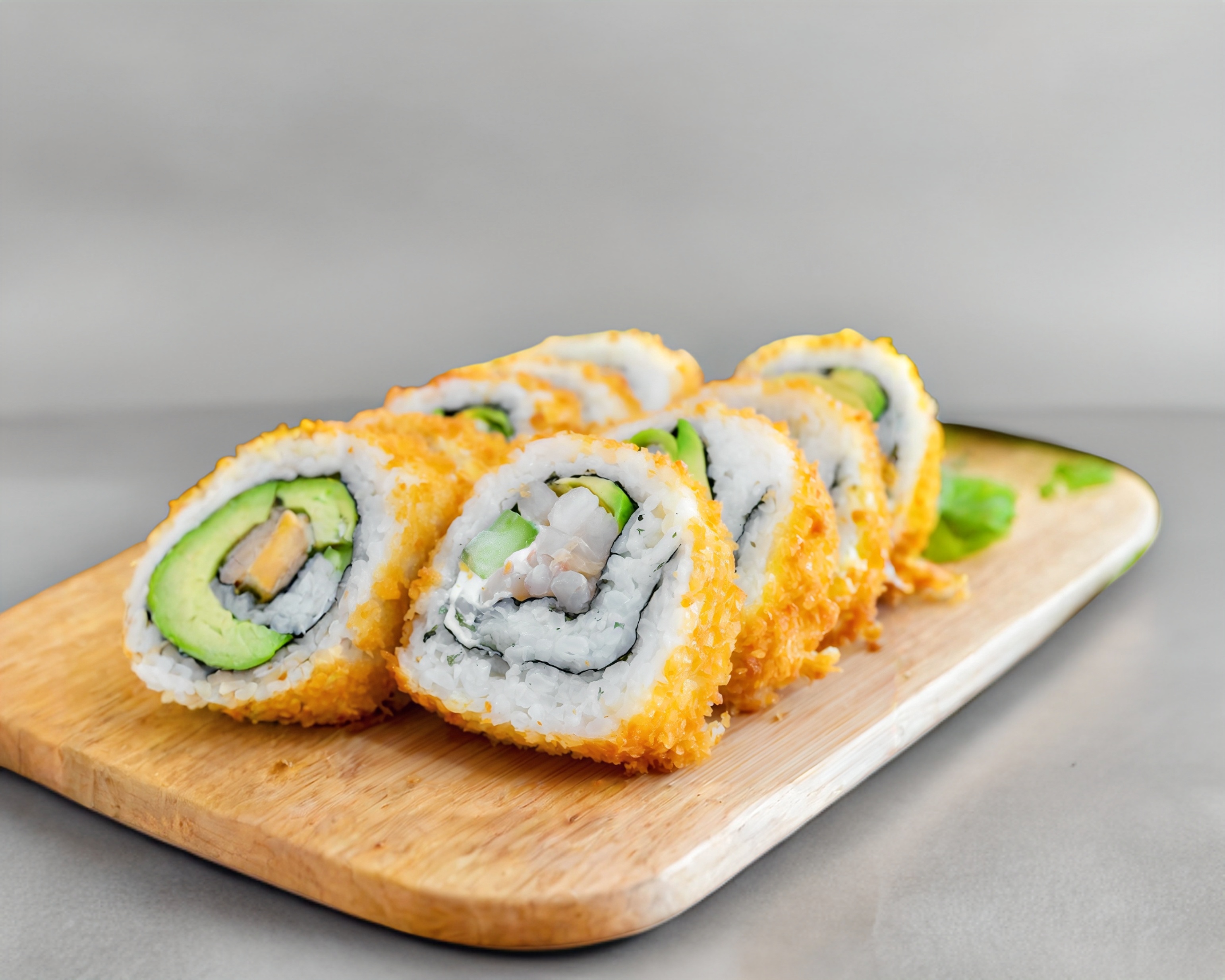 Rollo caliente con camarón, aguacate, pepino, philadelphia. Acompañado con salsa de soya y aderezo chipotle