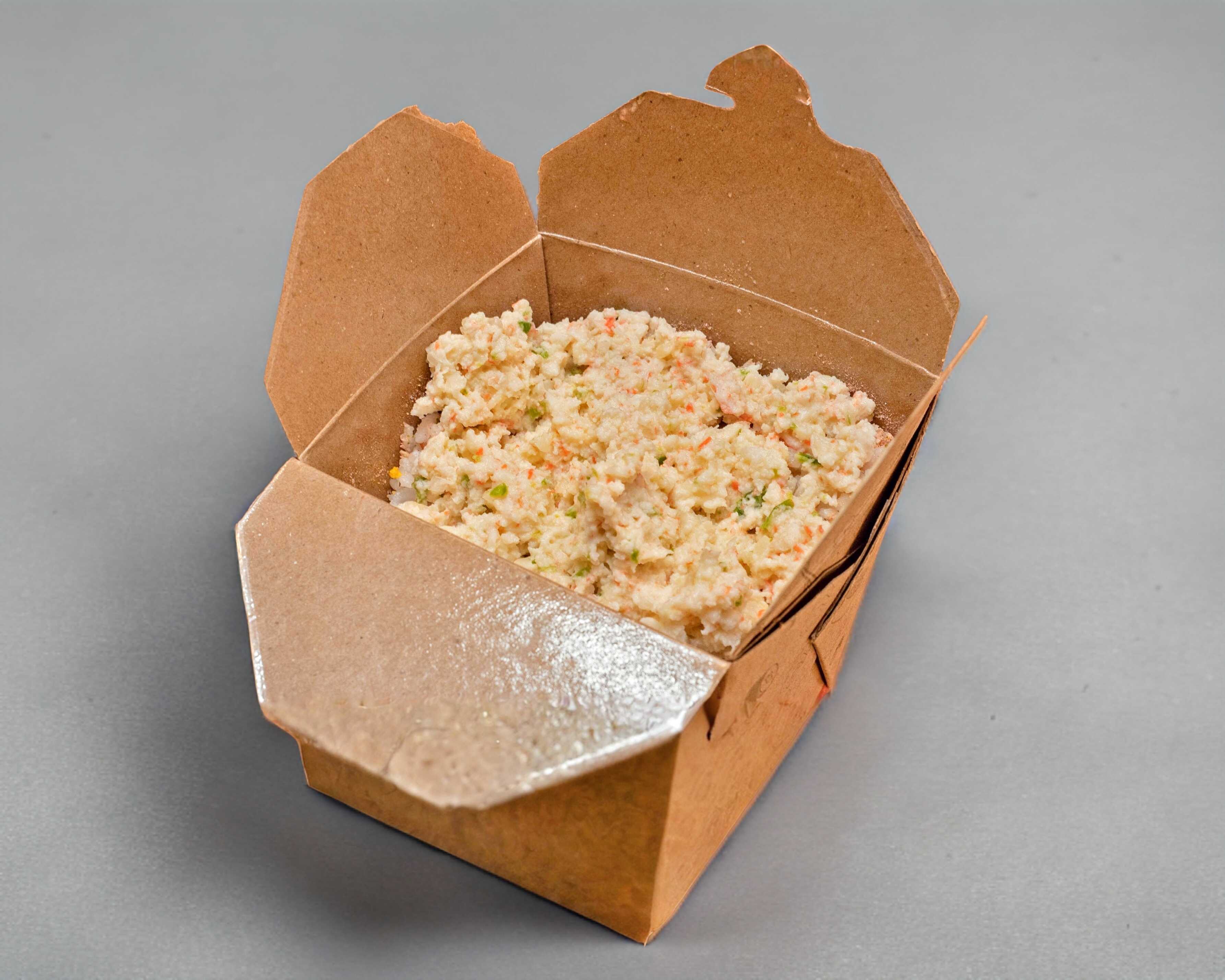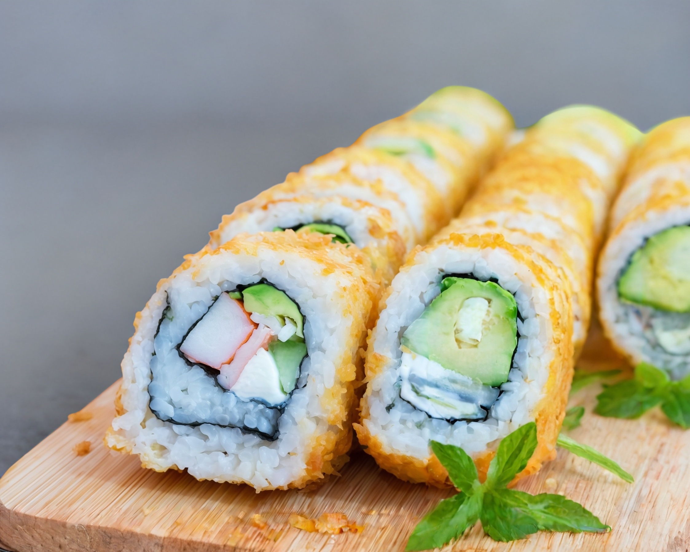 Rollo caliente de surimi, con aguacate, pepino y philadelphia. Acompañado de salsa de soya y aderezo chipotle