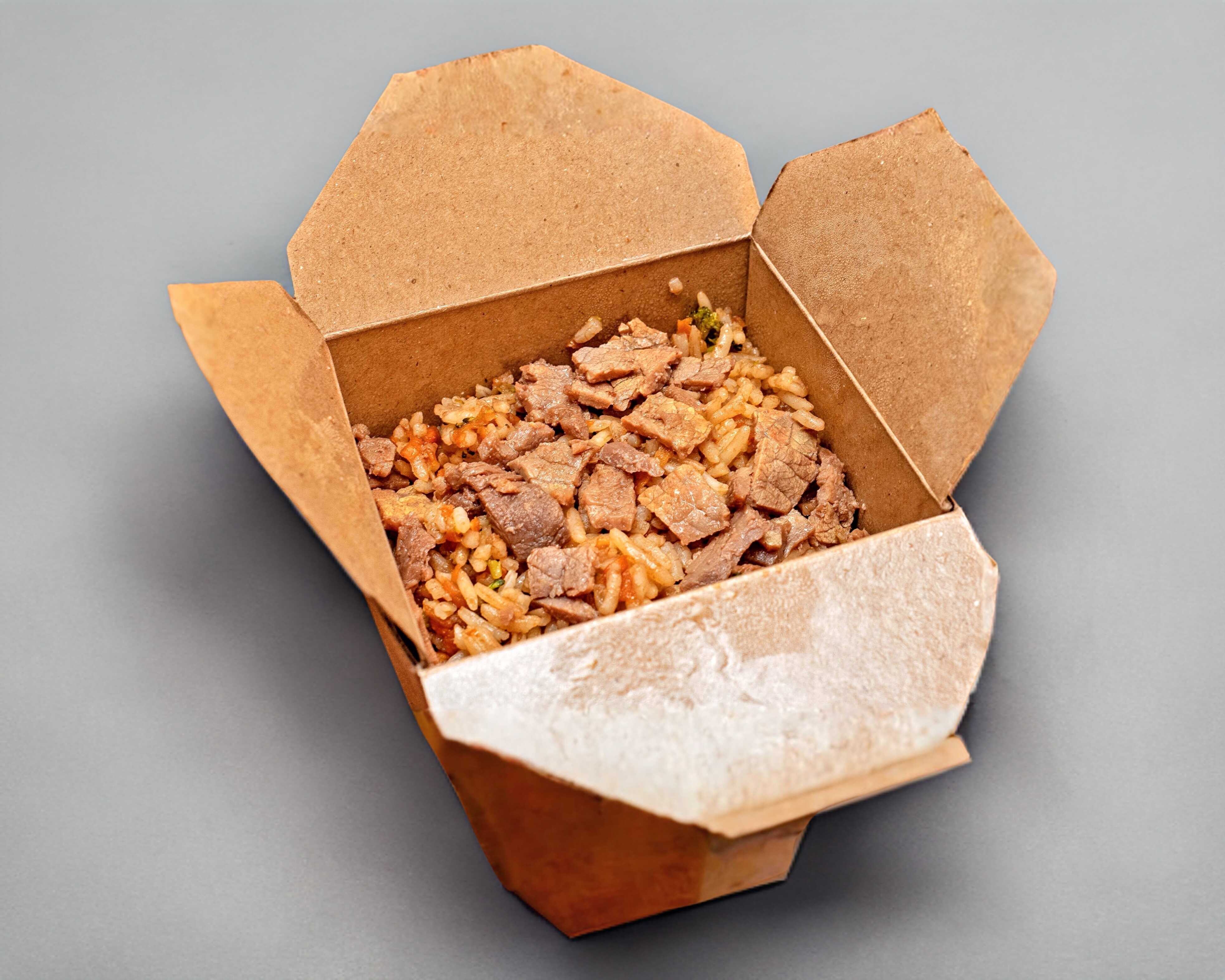 Arroz frito con vegetales, acompañado de carne, camaron y pollo