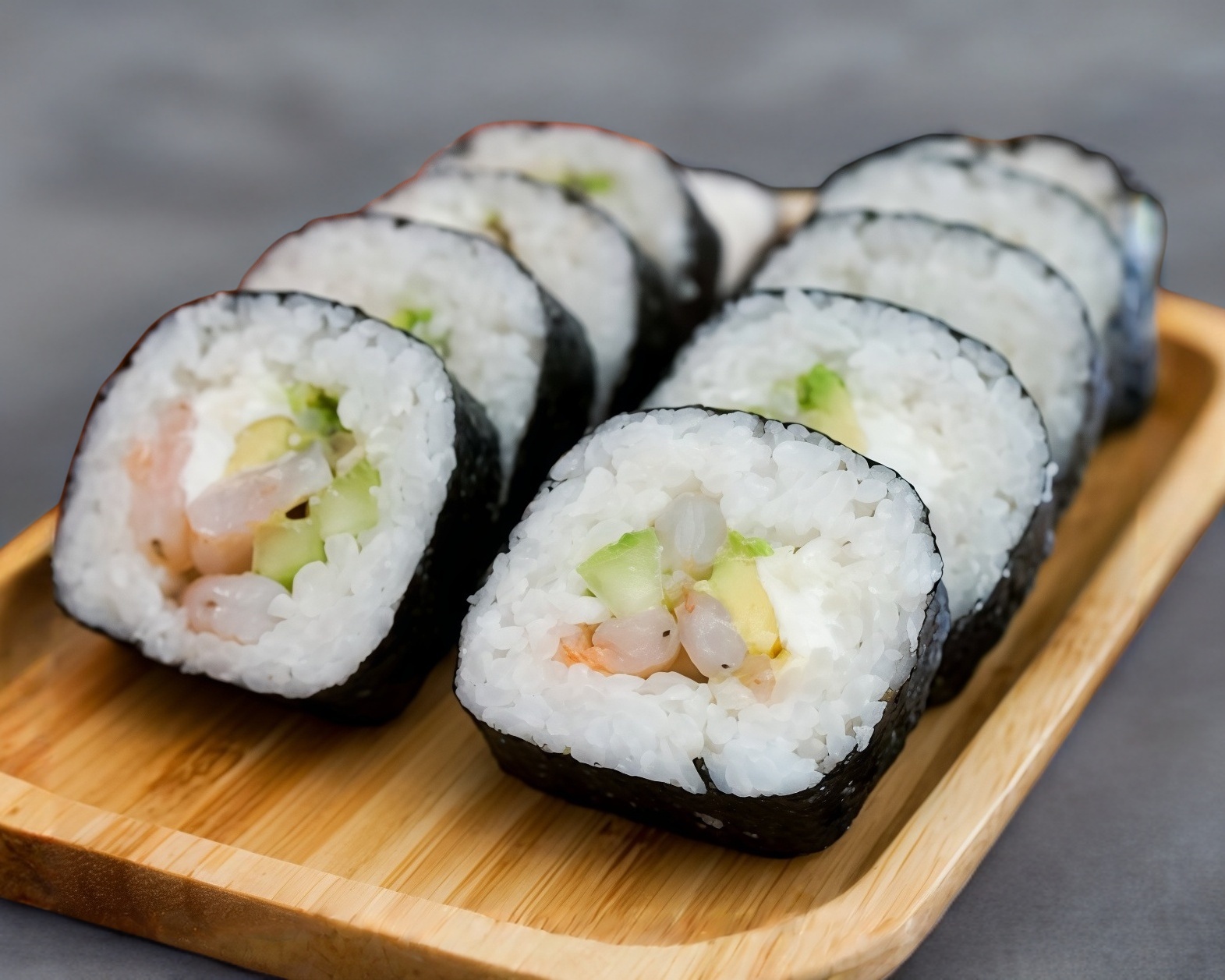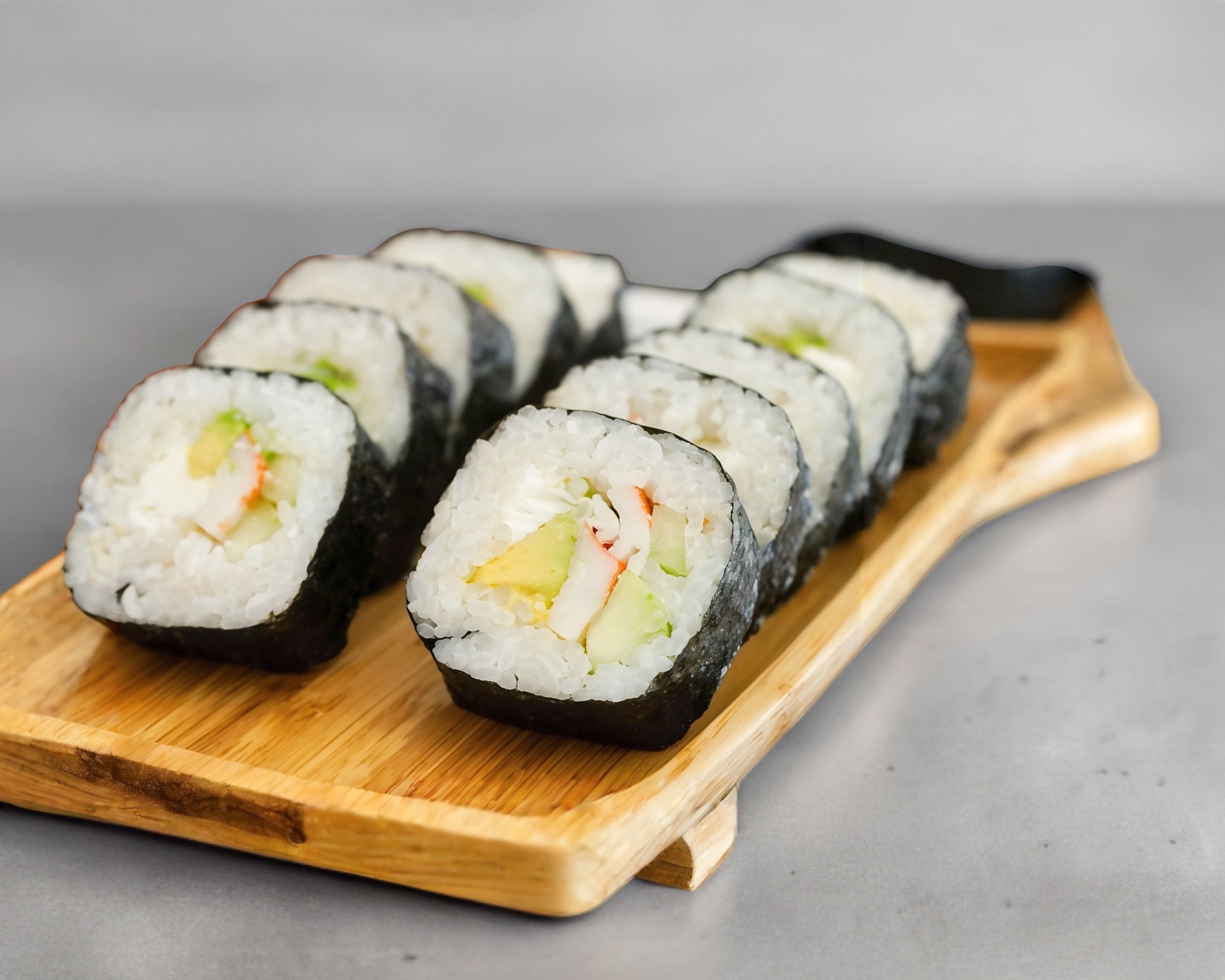 Rollo frío con alga por dentro, por dentro surimi, pepino y aguacate