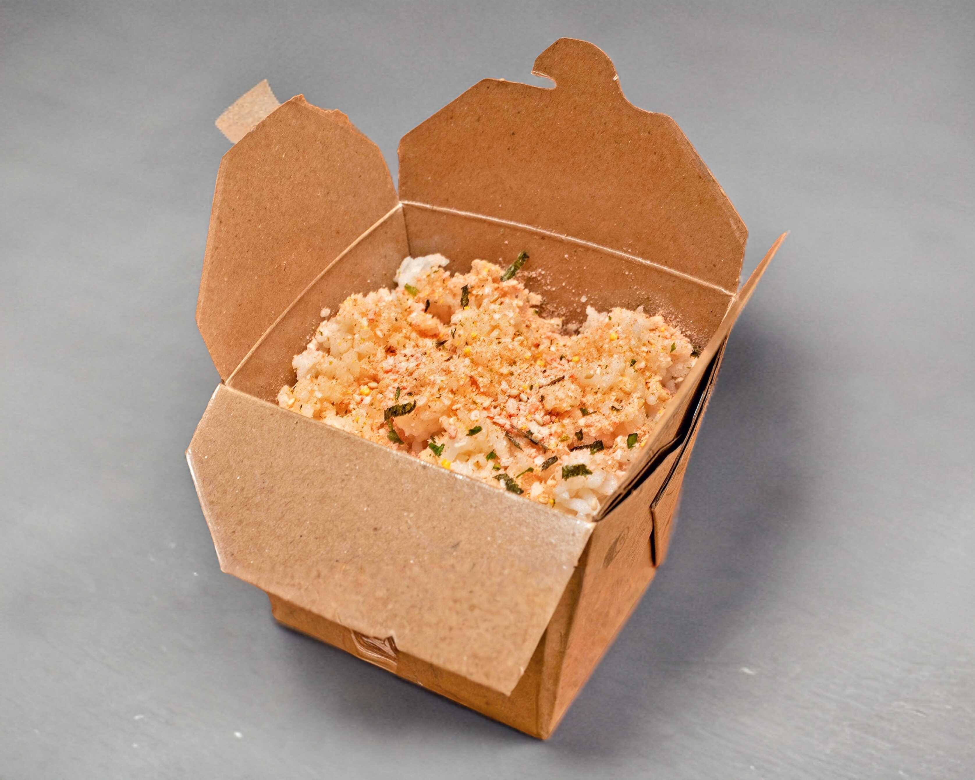 Rollo frío, relleno de camarones empanizados, philadelphia con furikake por fuera. Acompañado de salsa de soya y aderezo chipotle