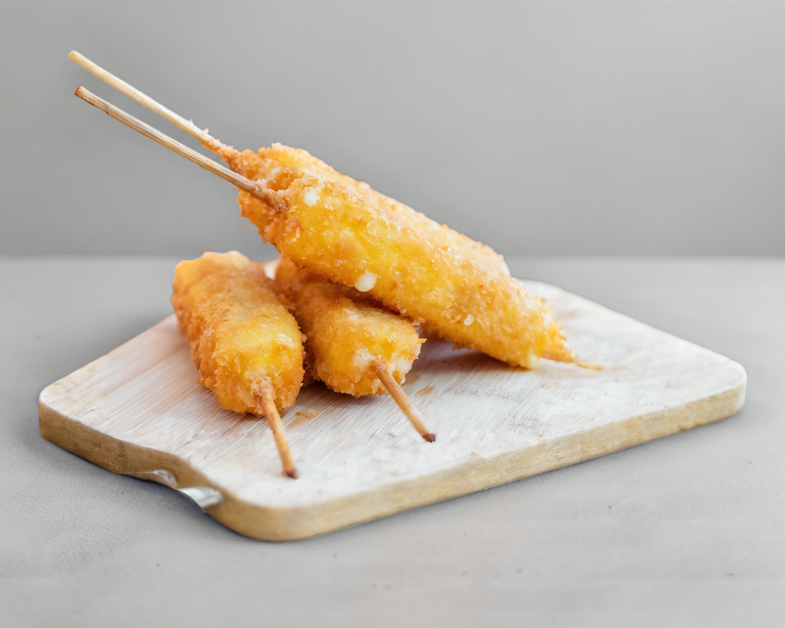2 Brochetas de queso manchego y 2 brochetas de surimi, empanizadas con panko.