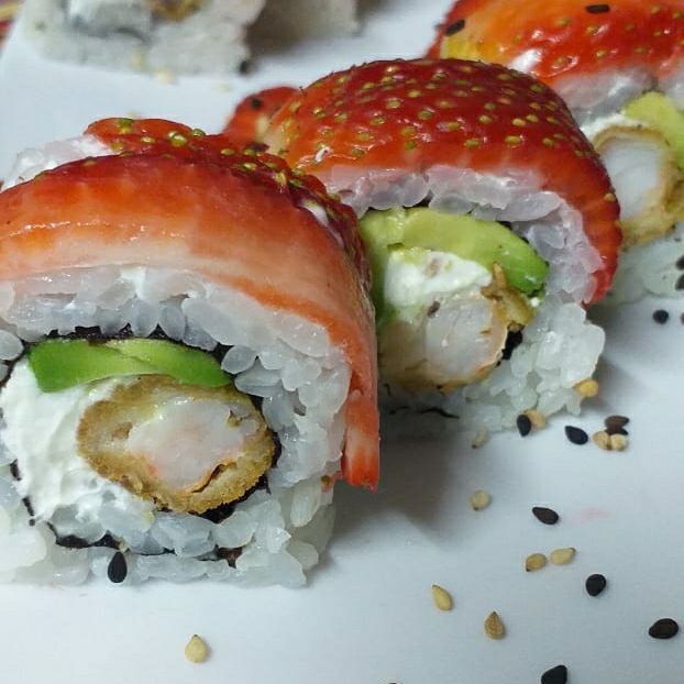 Camarón empanizado, aguacate, queso y fresa por fuera.