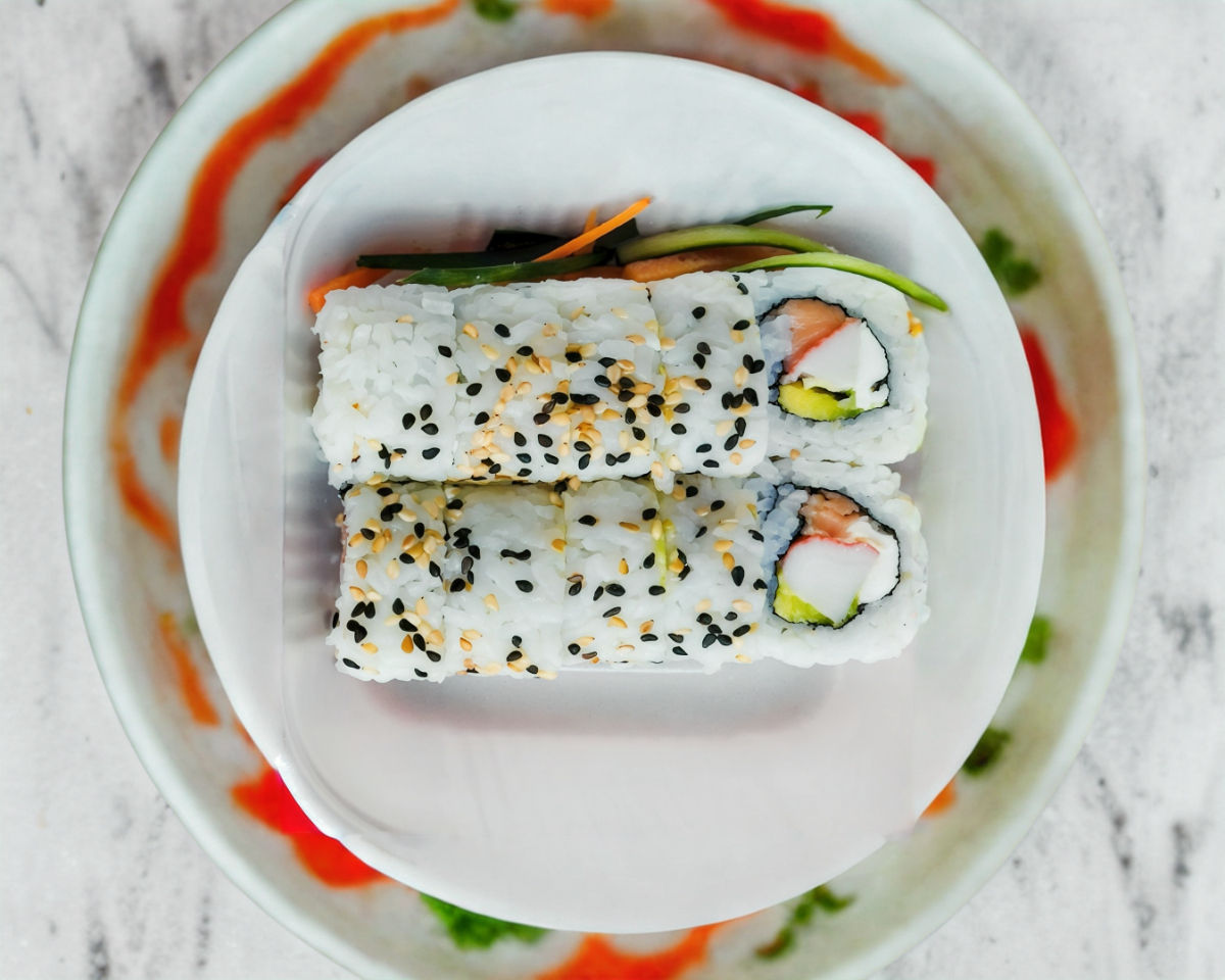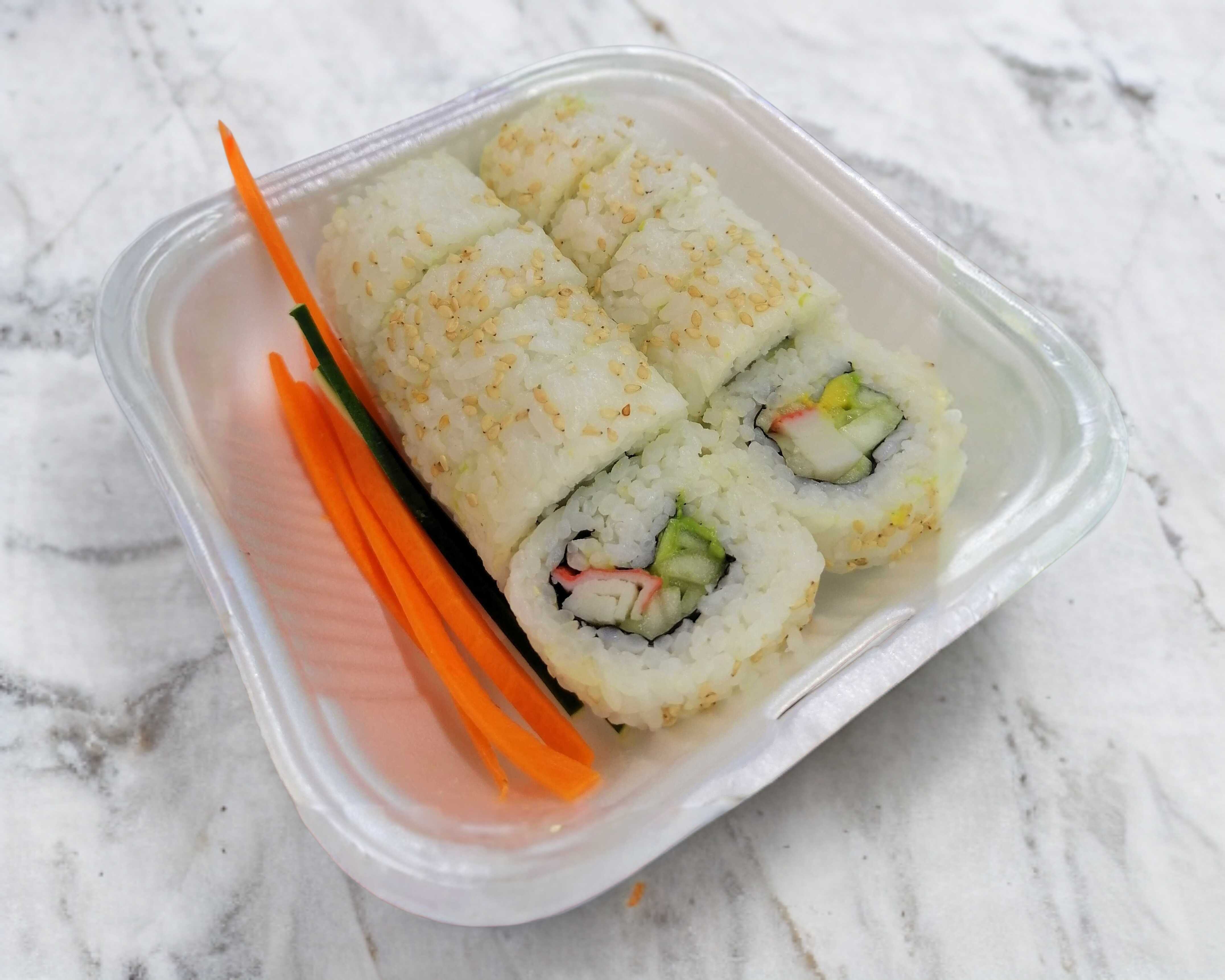 Zanahoria, pepino, aguacate, salmón y surimi.