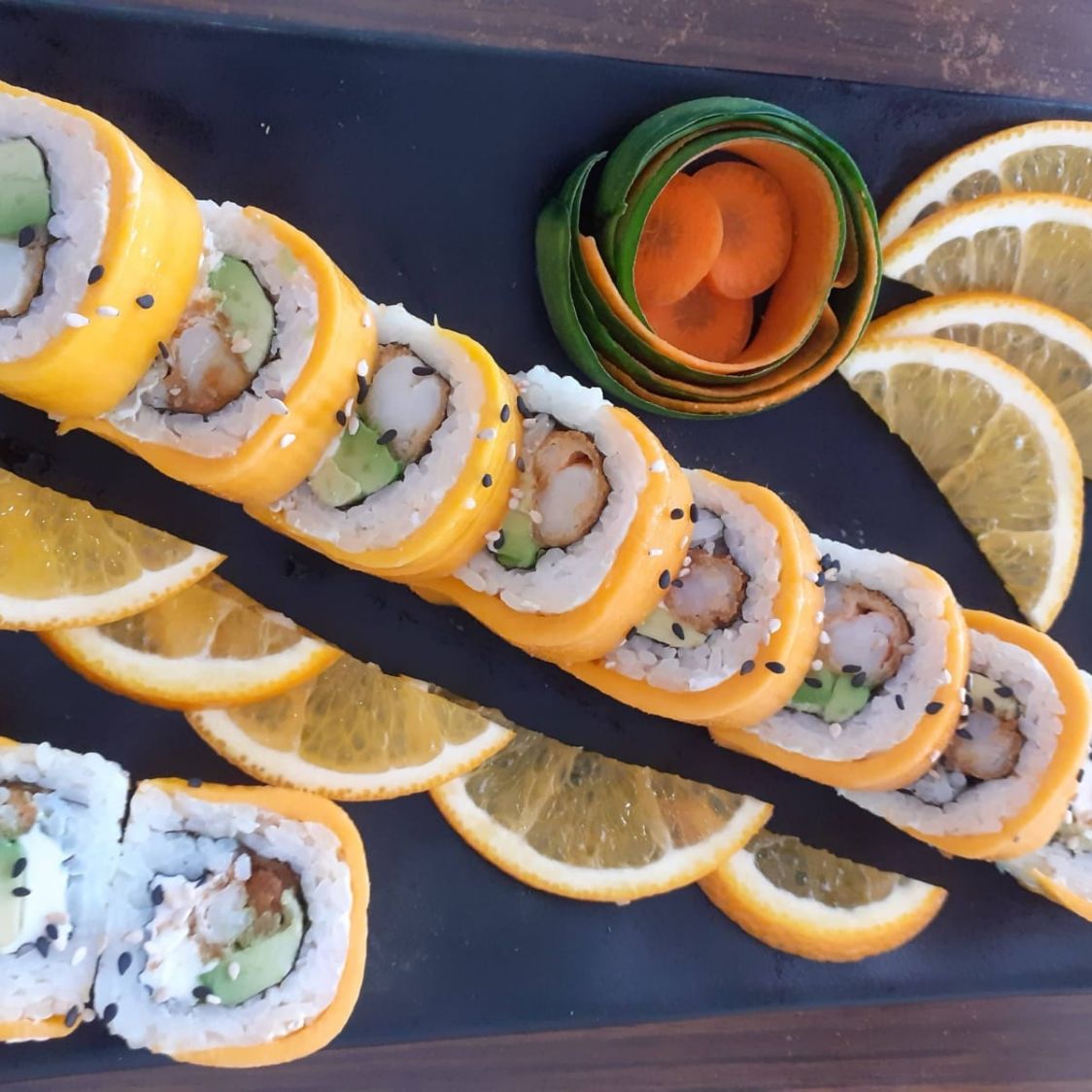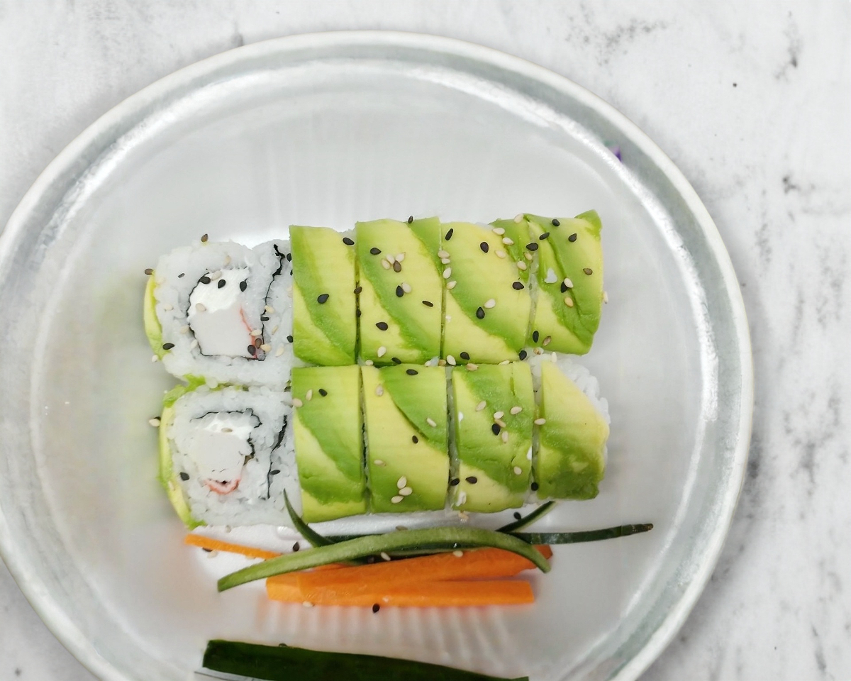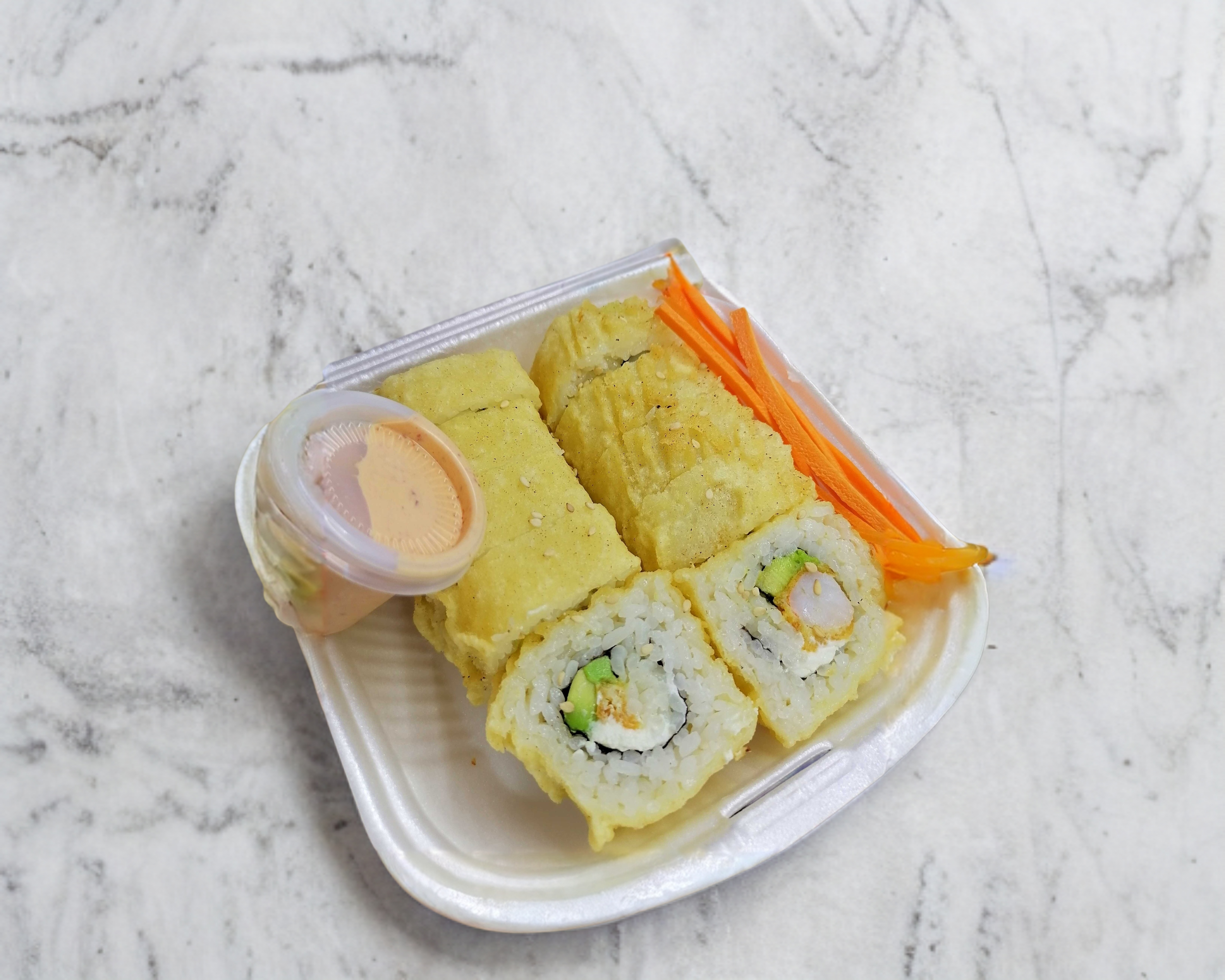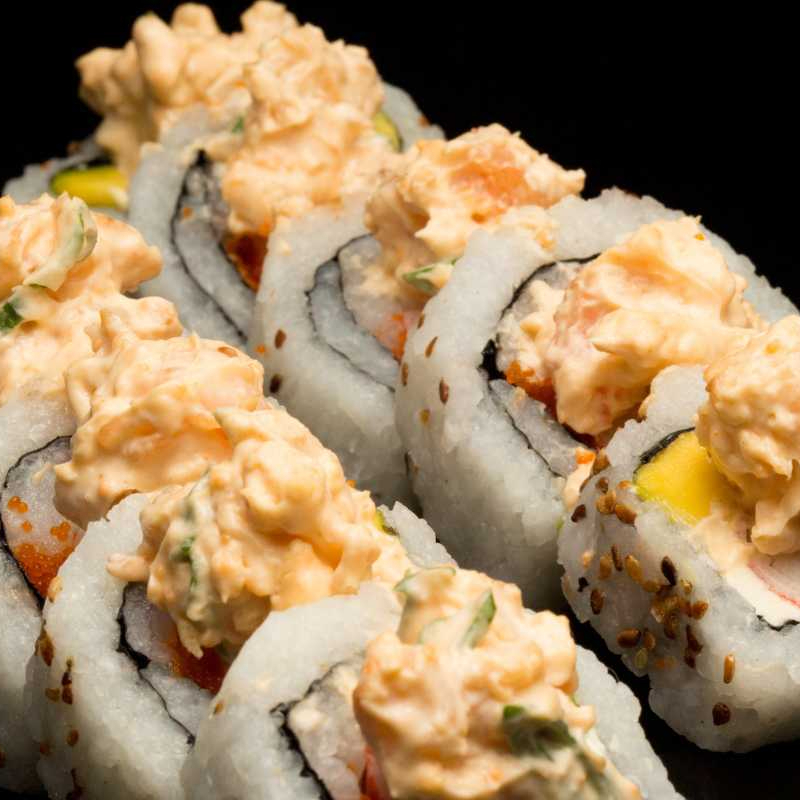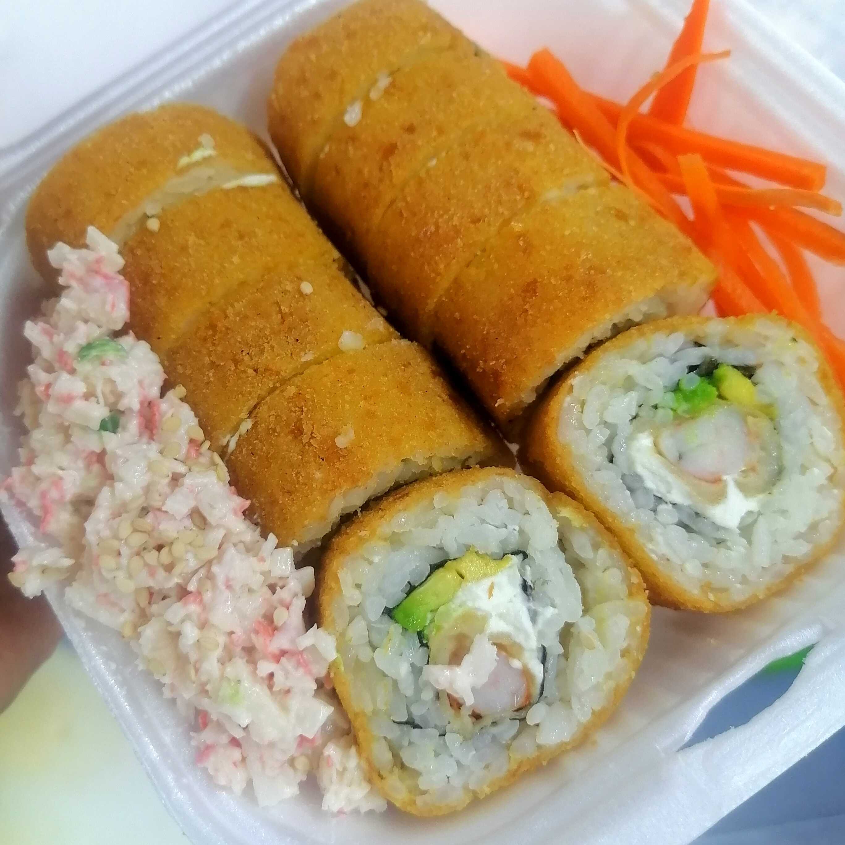 Camarón, aguacate, queso por dentro y surimi por fuera.