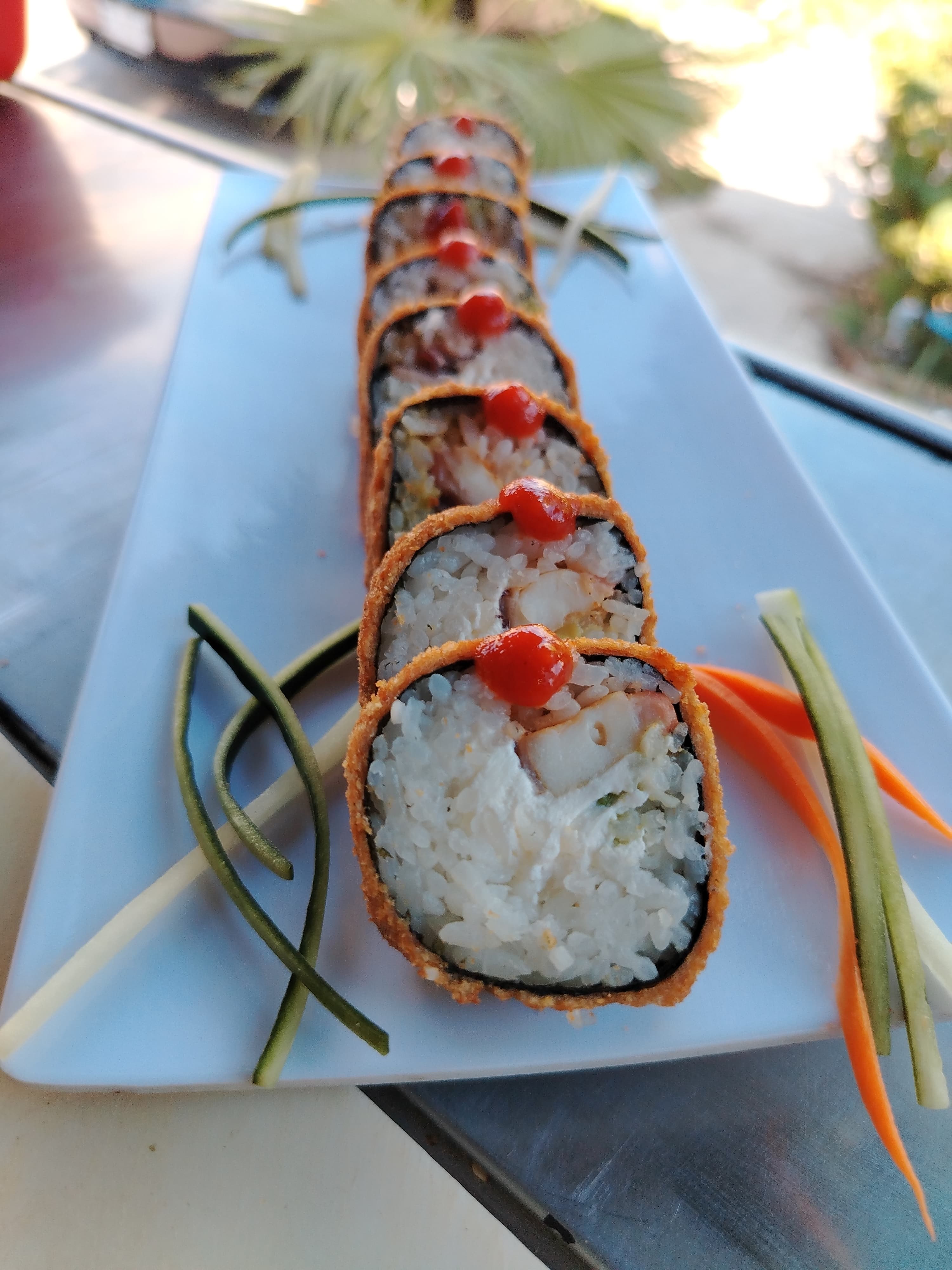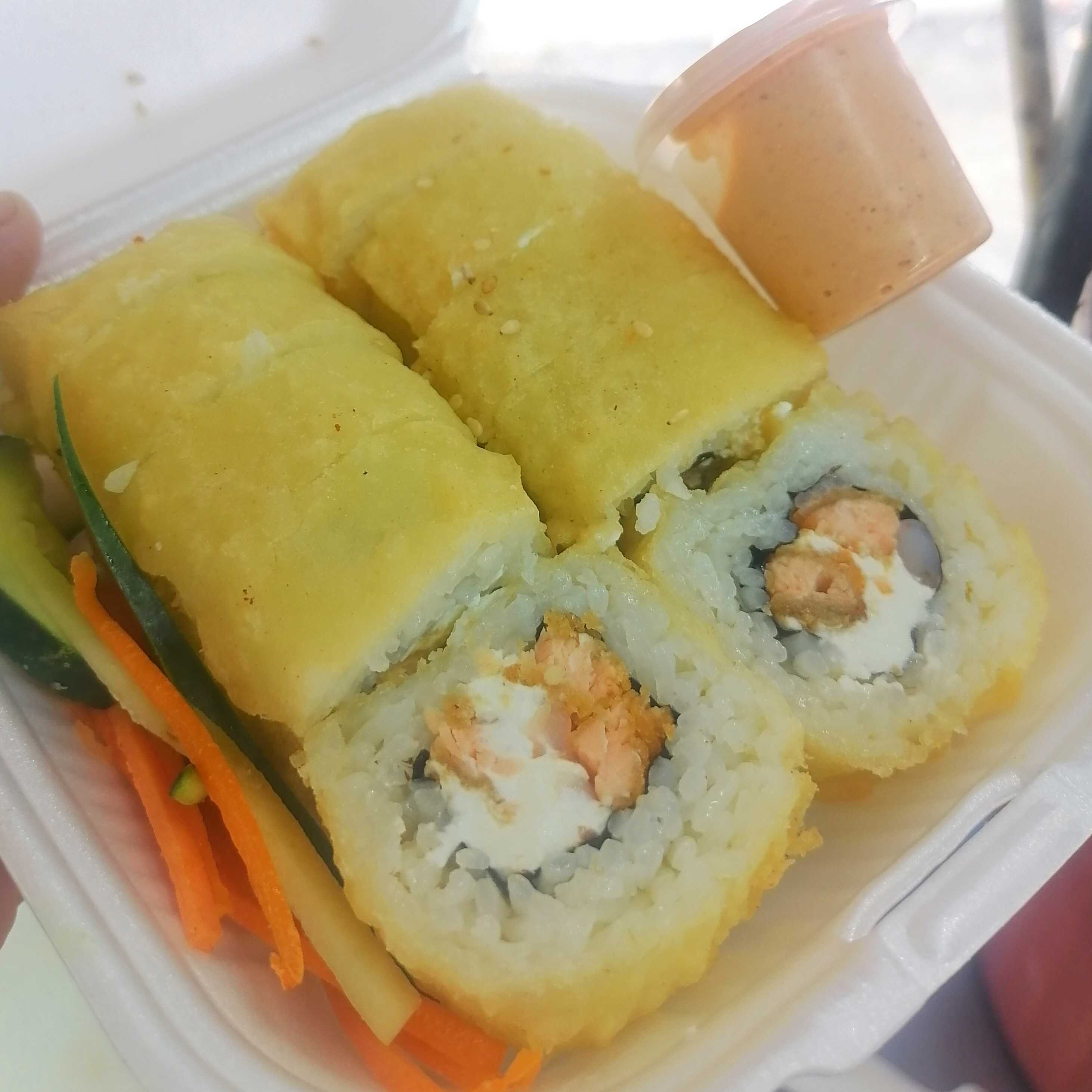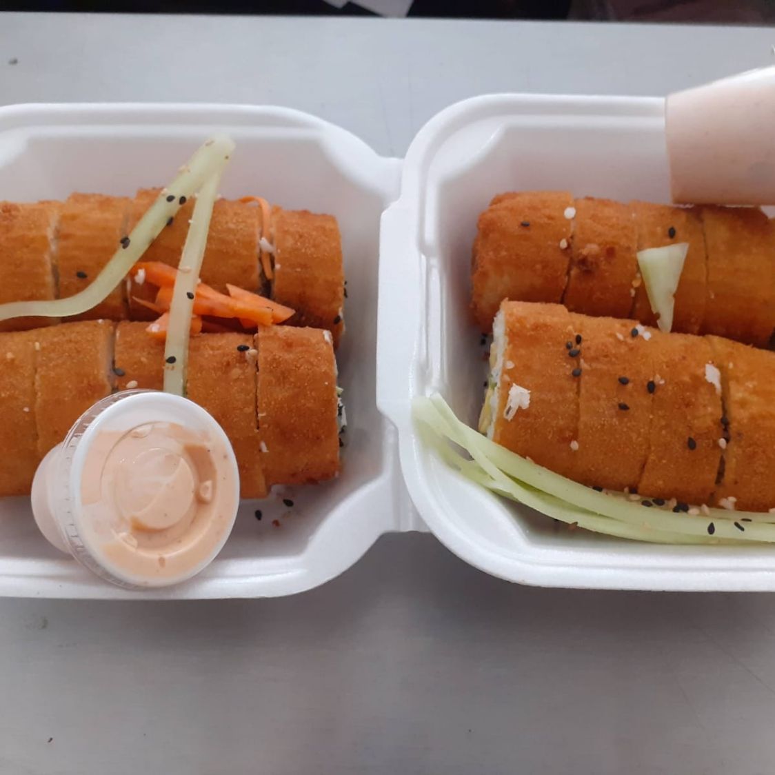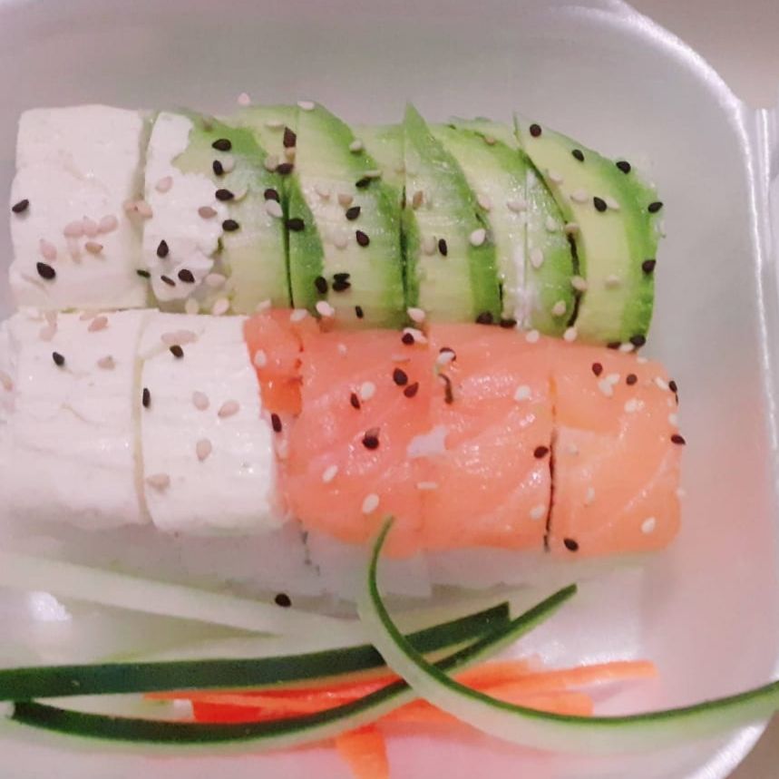 Salmón empanizado, pepino, queso y aguacate por fuera.