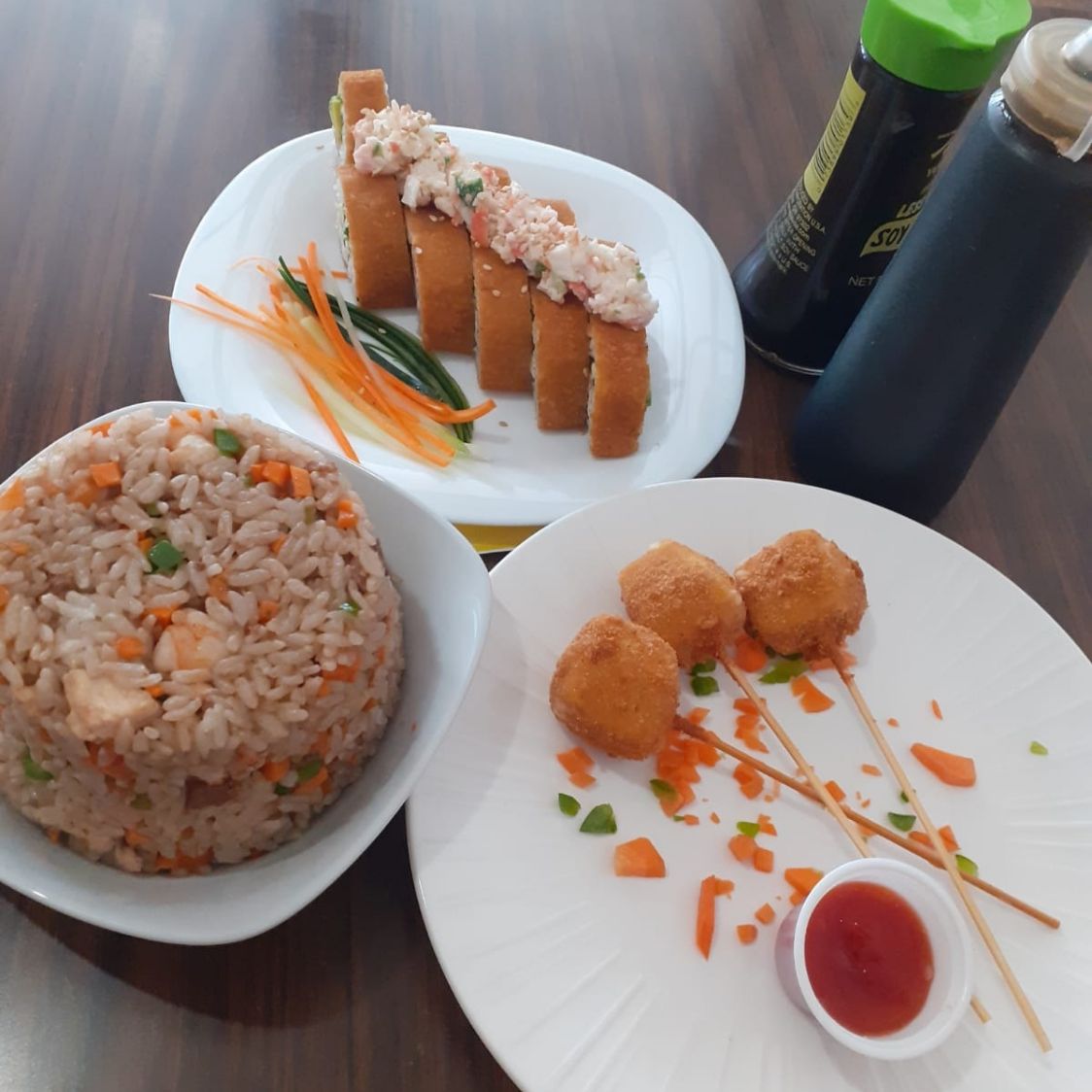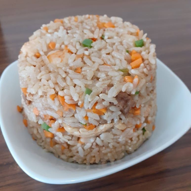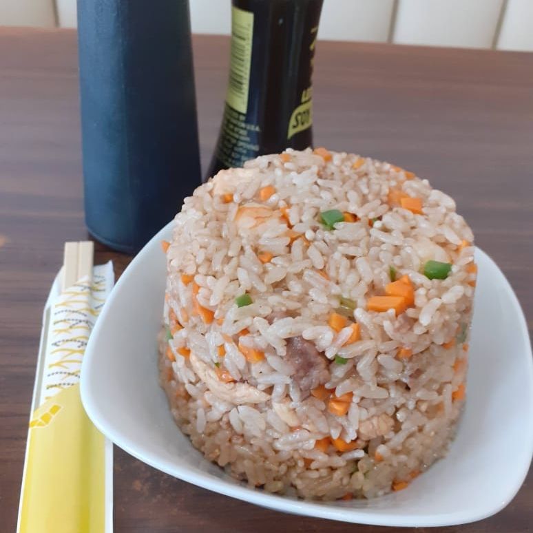 Arroz frito a la plancha con zanahoria, morrón, pollo, carne y camarón.