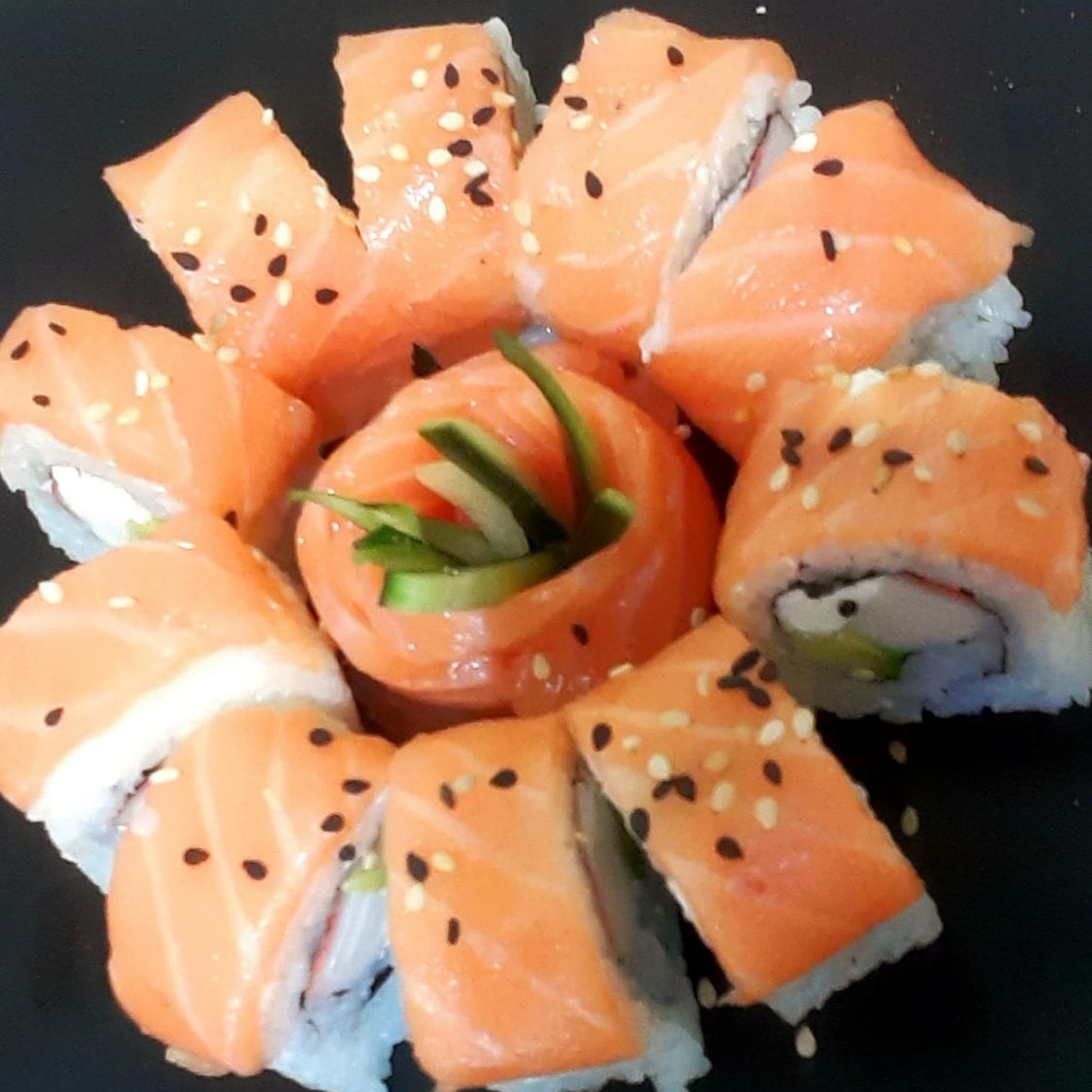 Surimi, aguacate, pepino y queso por dentro, salmón por fuera.