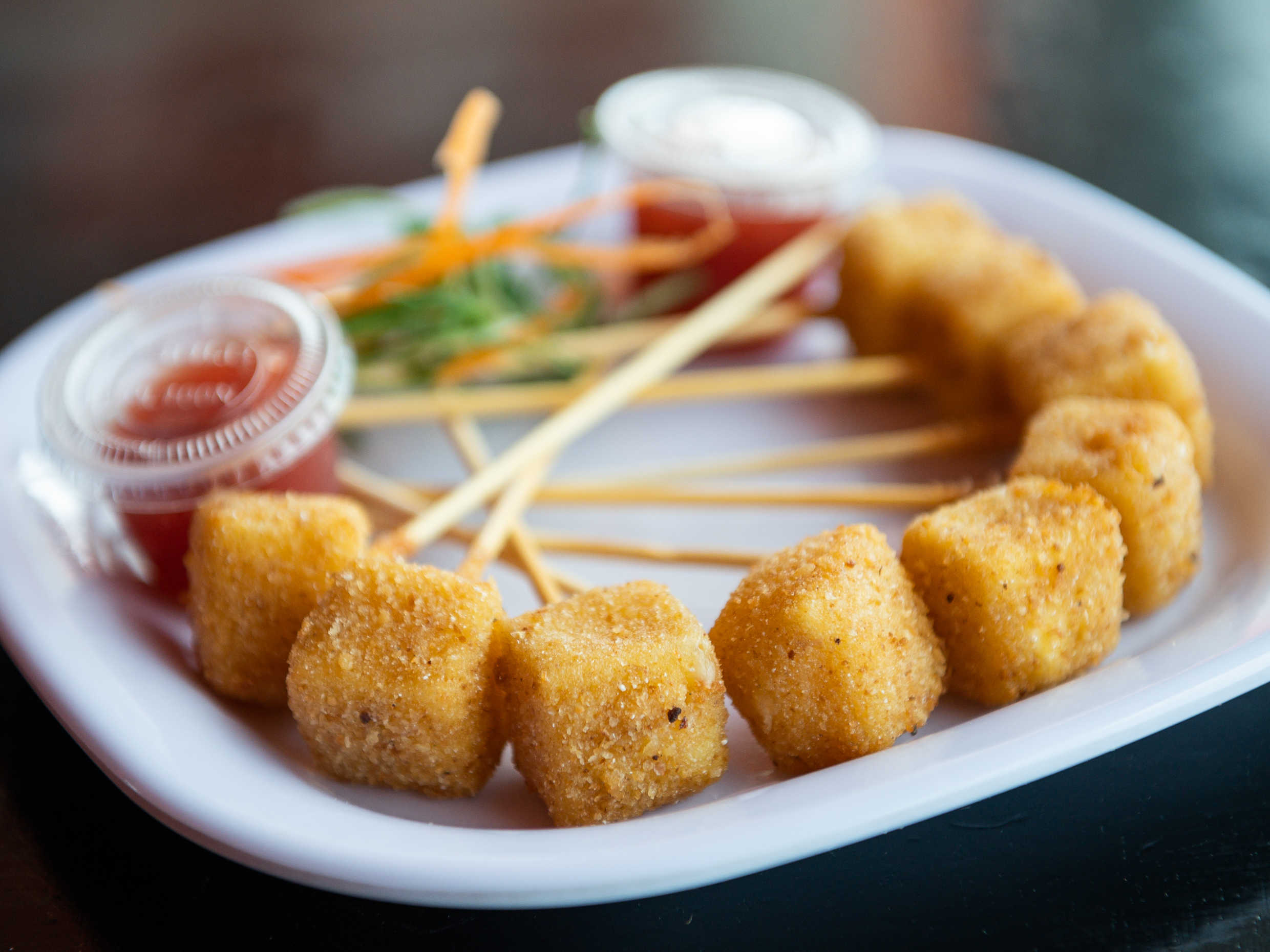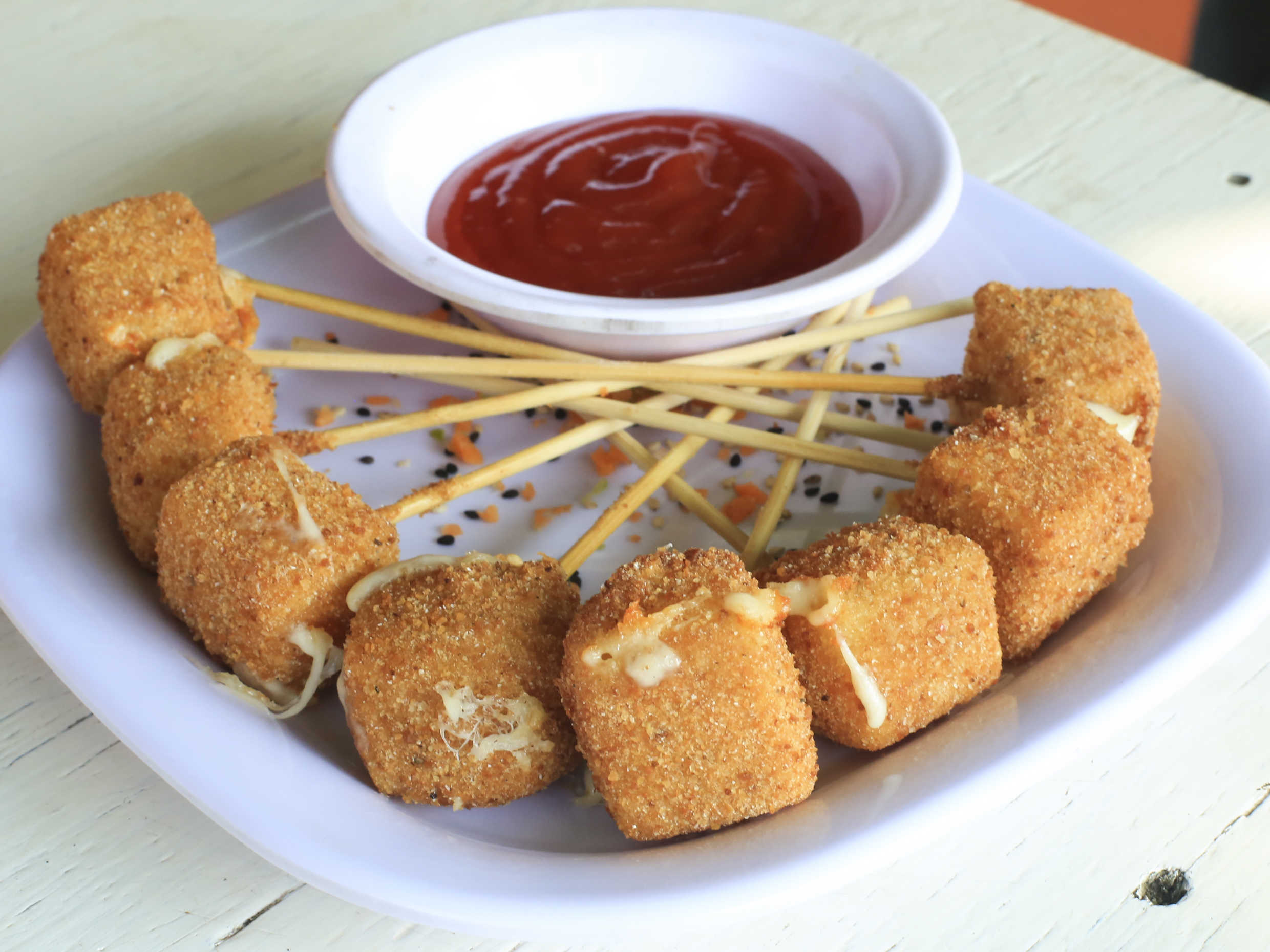 3 piezas, manchego, 1 pieza de salmón, 1 brocheta de pollo.