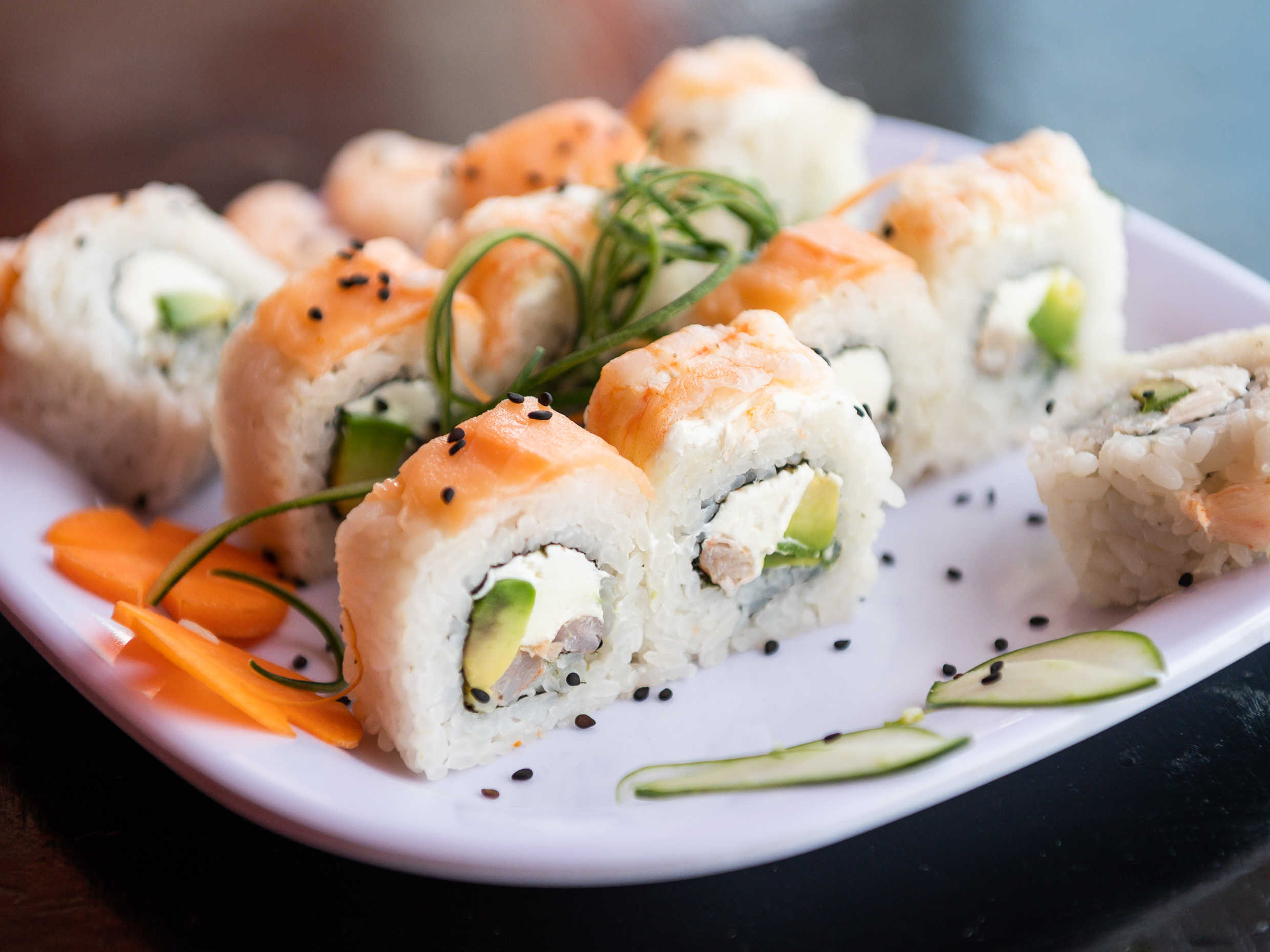 Camarón, queso, aguacate, por fuera camarón y salmón.