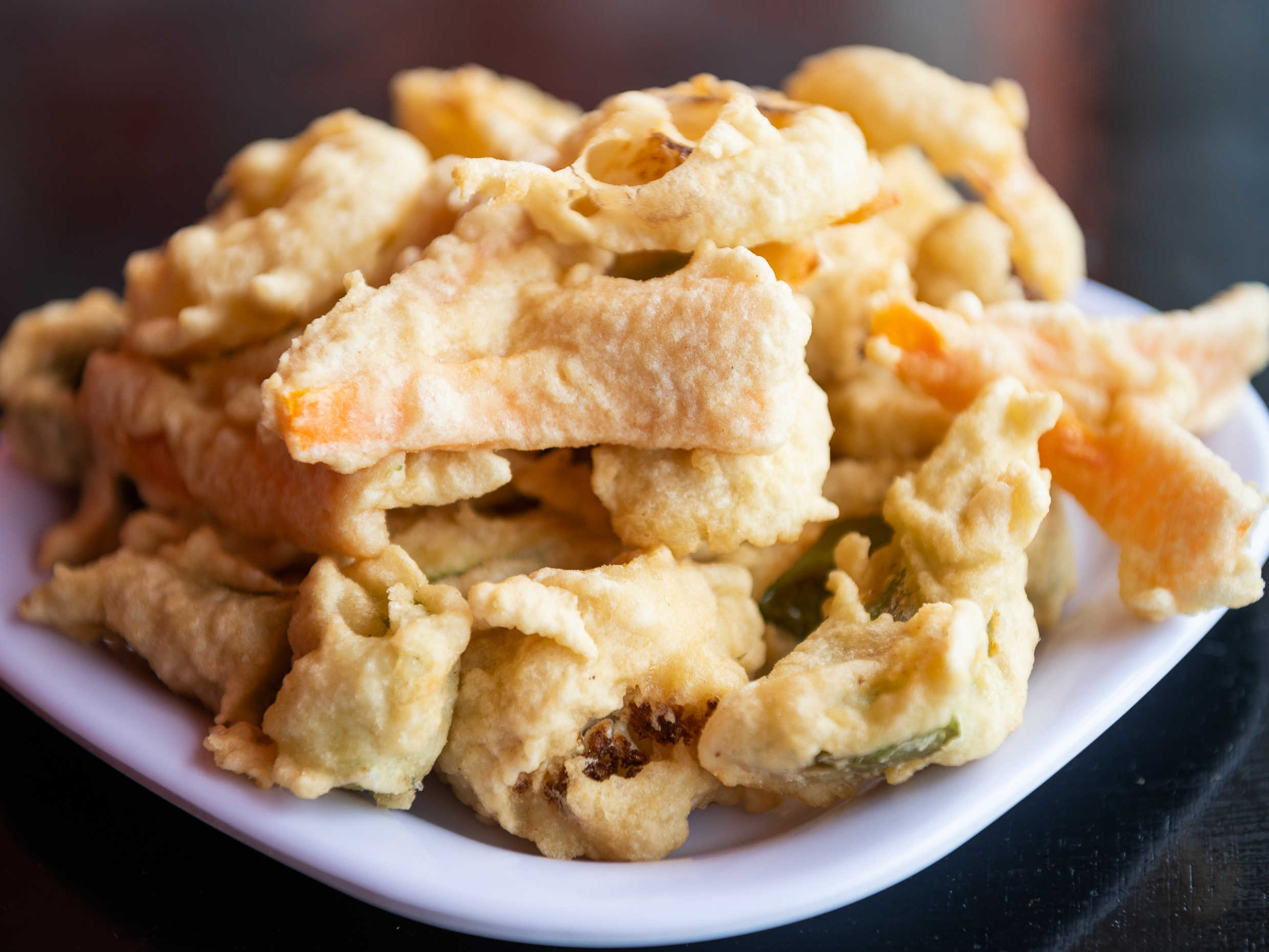 Camarón tempura, aguacate, queso, pasta surimi a lado.