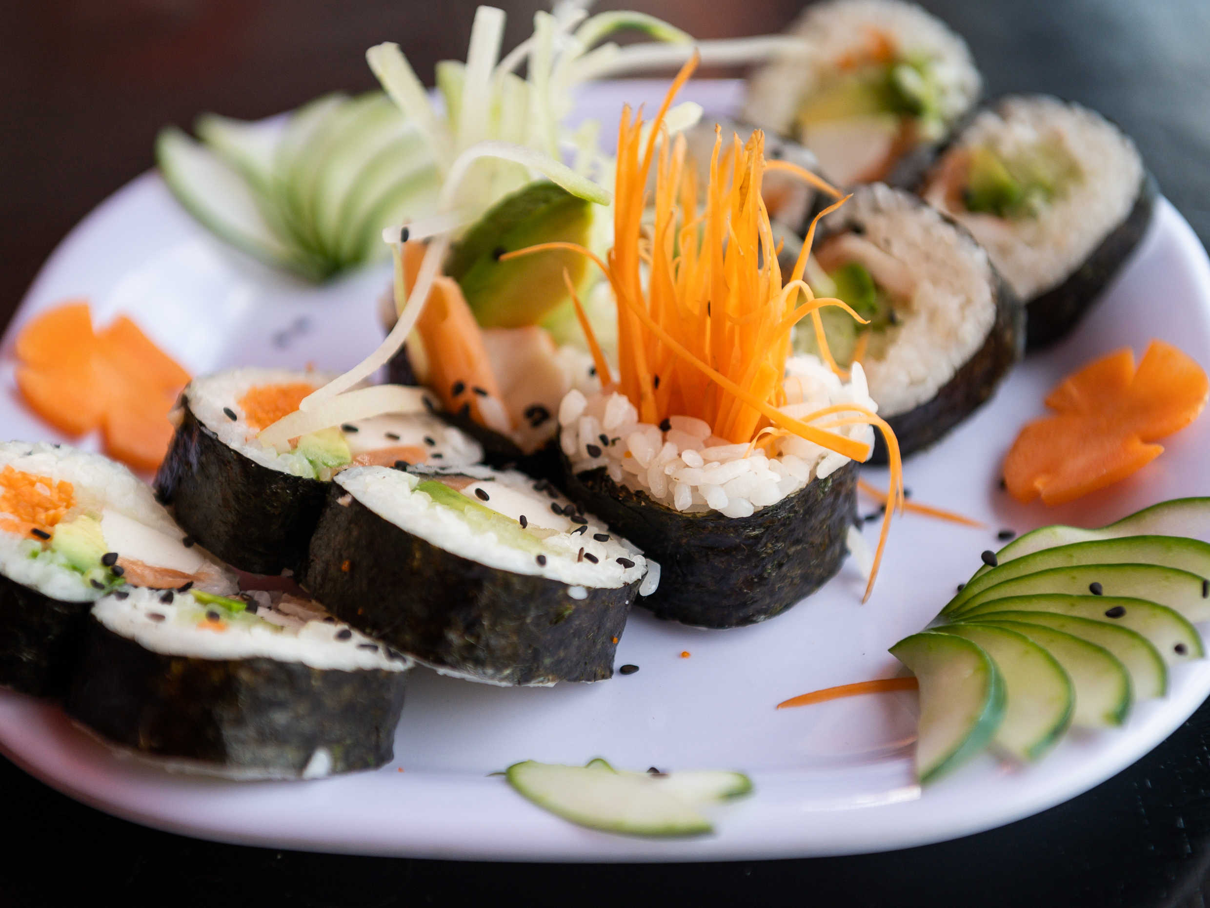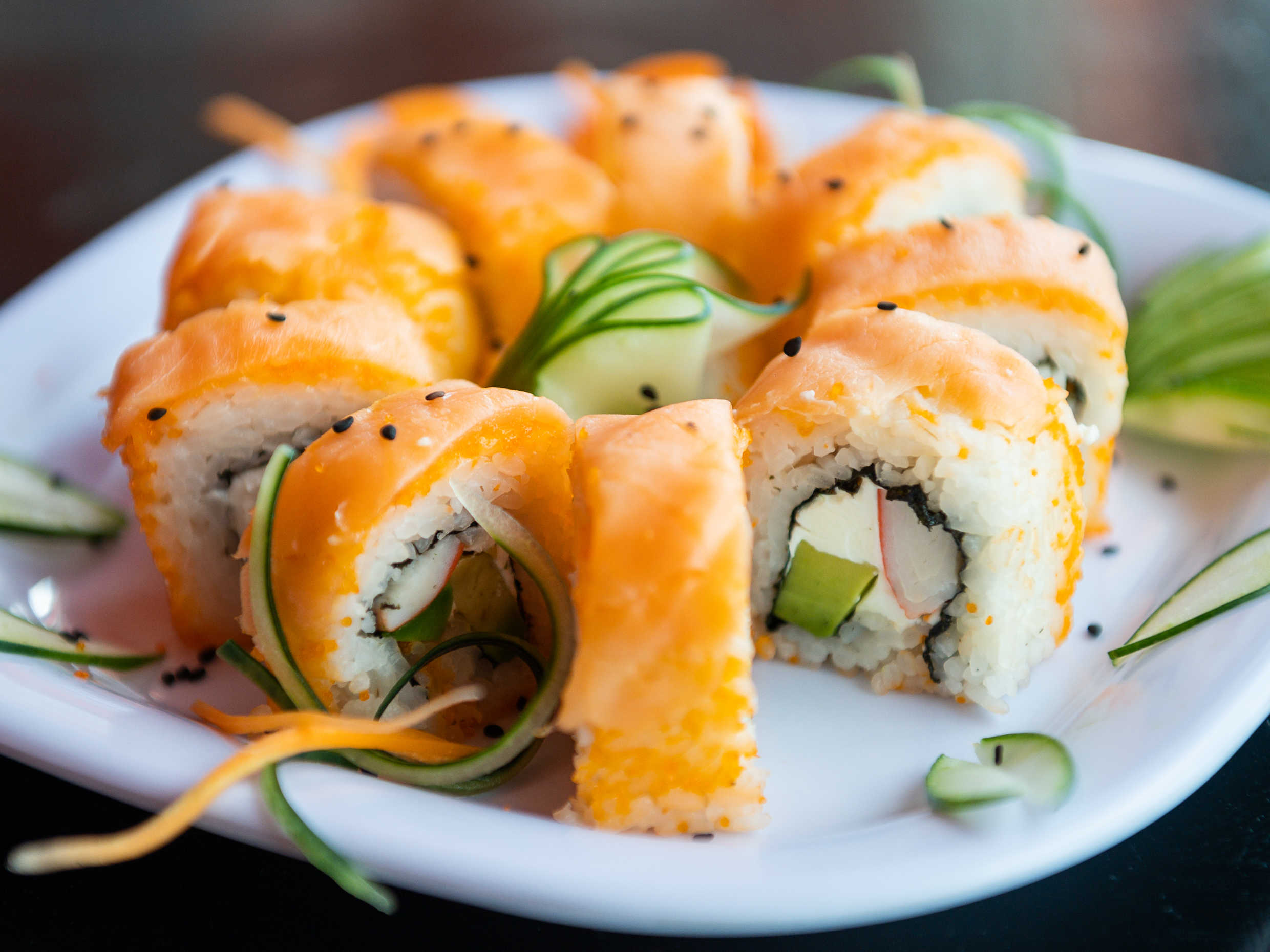 Aguacate, pepino, zanahoria, salmón y surimi.