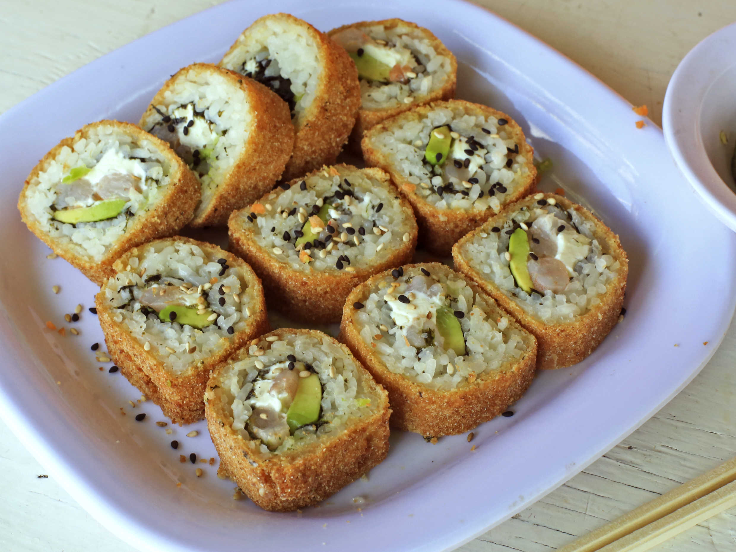 Pollo empanizado, aguacate, philadelphia, chipotle por fuera.
