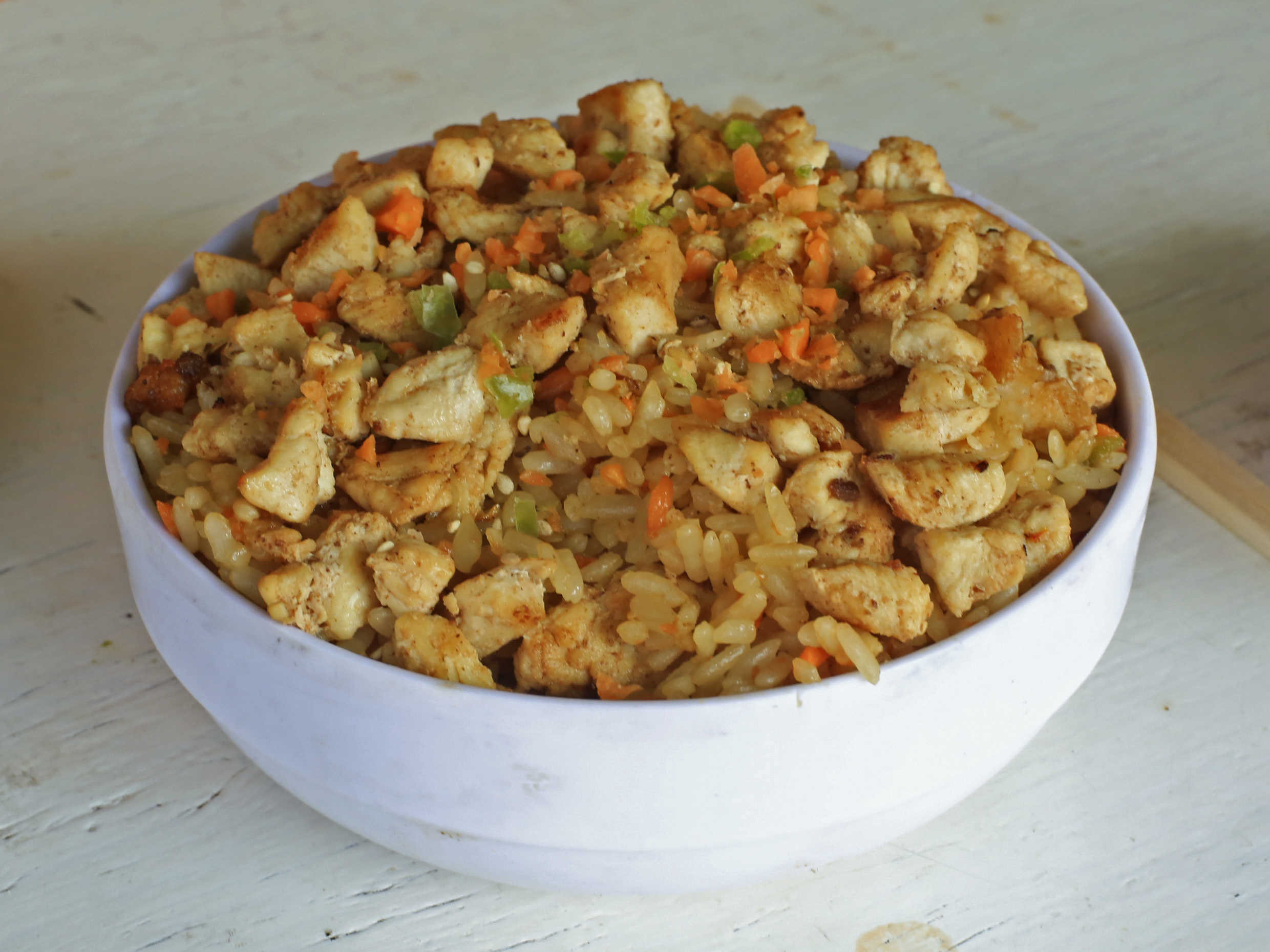 Arroz frito, carne, cebollin, chipotle, aguacate y queso.