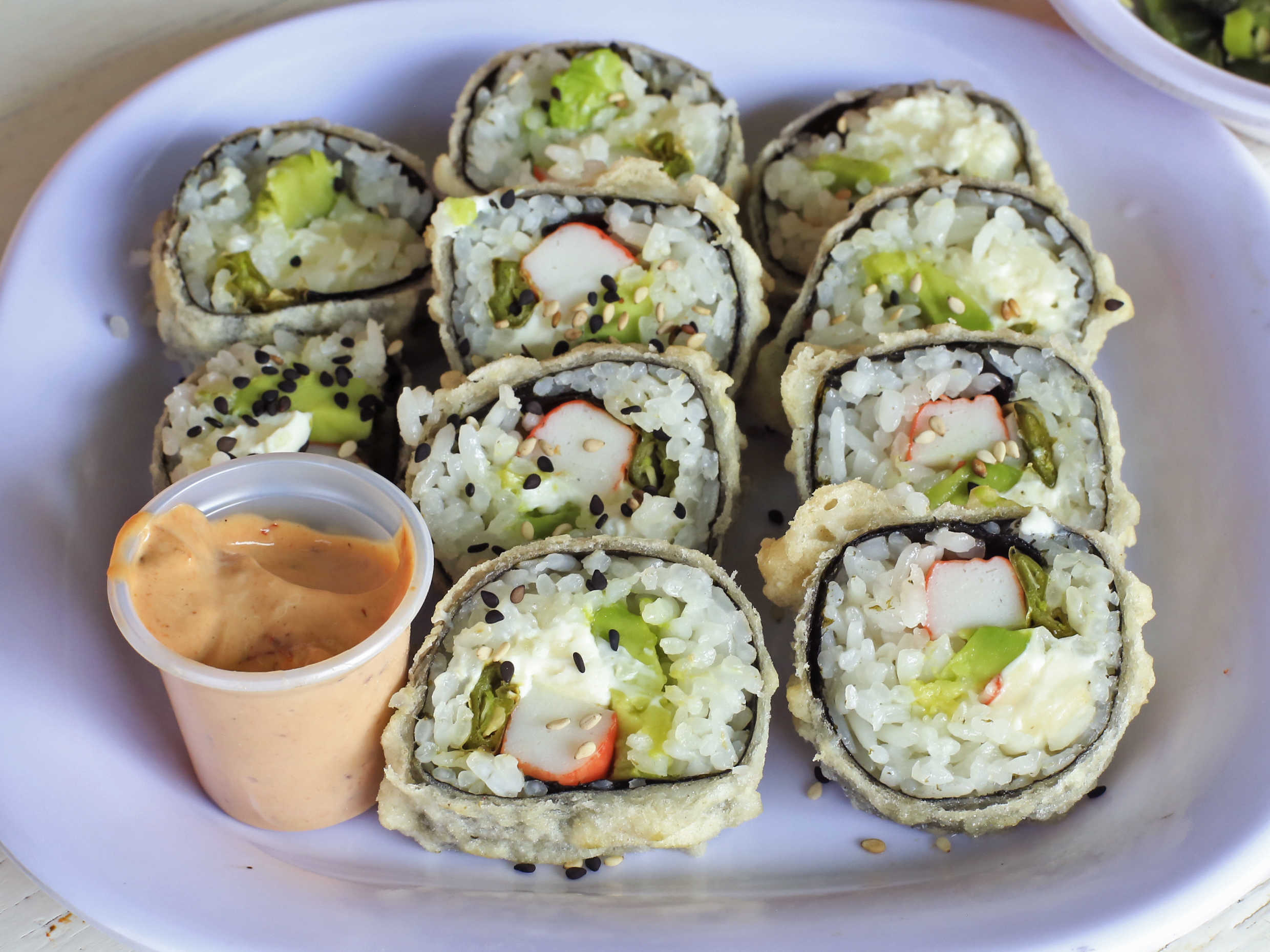 Arroz frito, camarón, tempura, aguacate, queso, tampico.