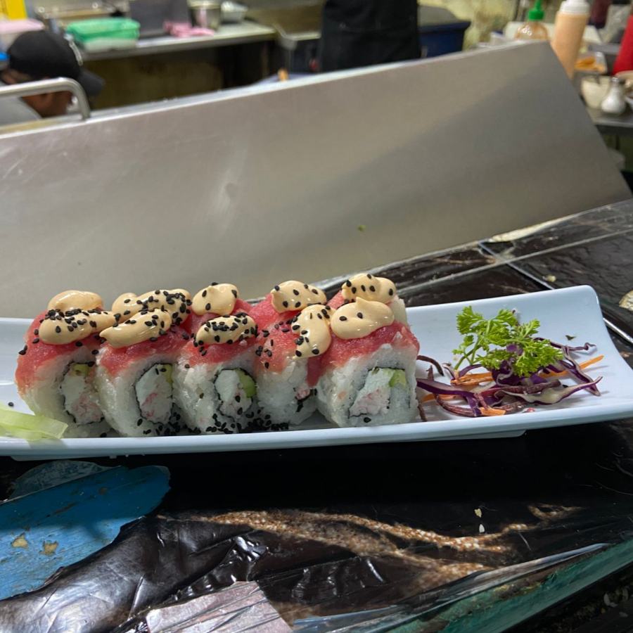 10 Piezas, queso y aguacate por fuera atún fresco con topping de mayonesa y masago.
