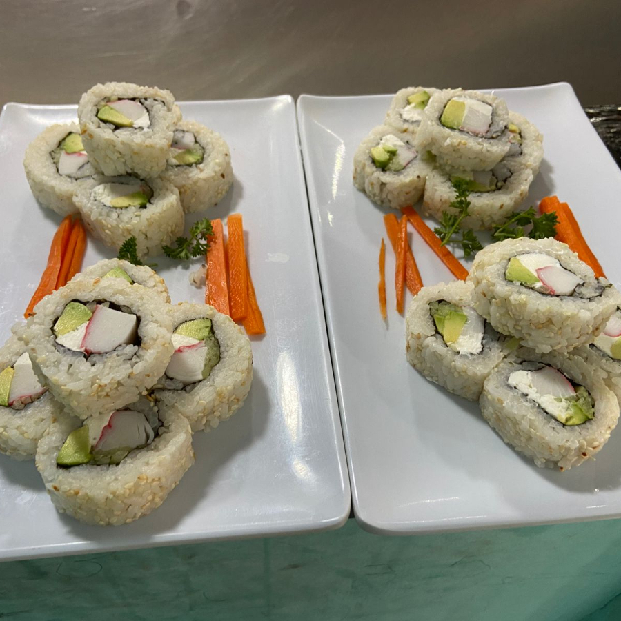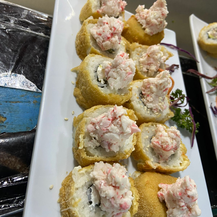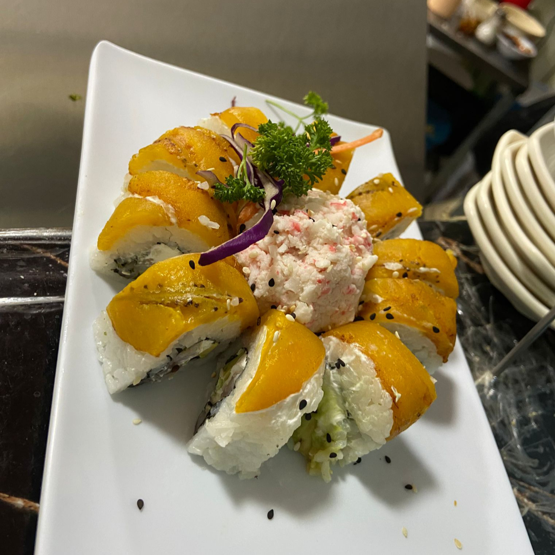 10 Piezas, por dentro aguacate y surimi, por fuera salmón horneado con mezclas de queso manchego y trozitos de camarón.