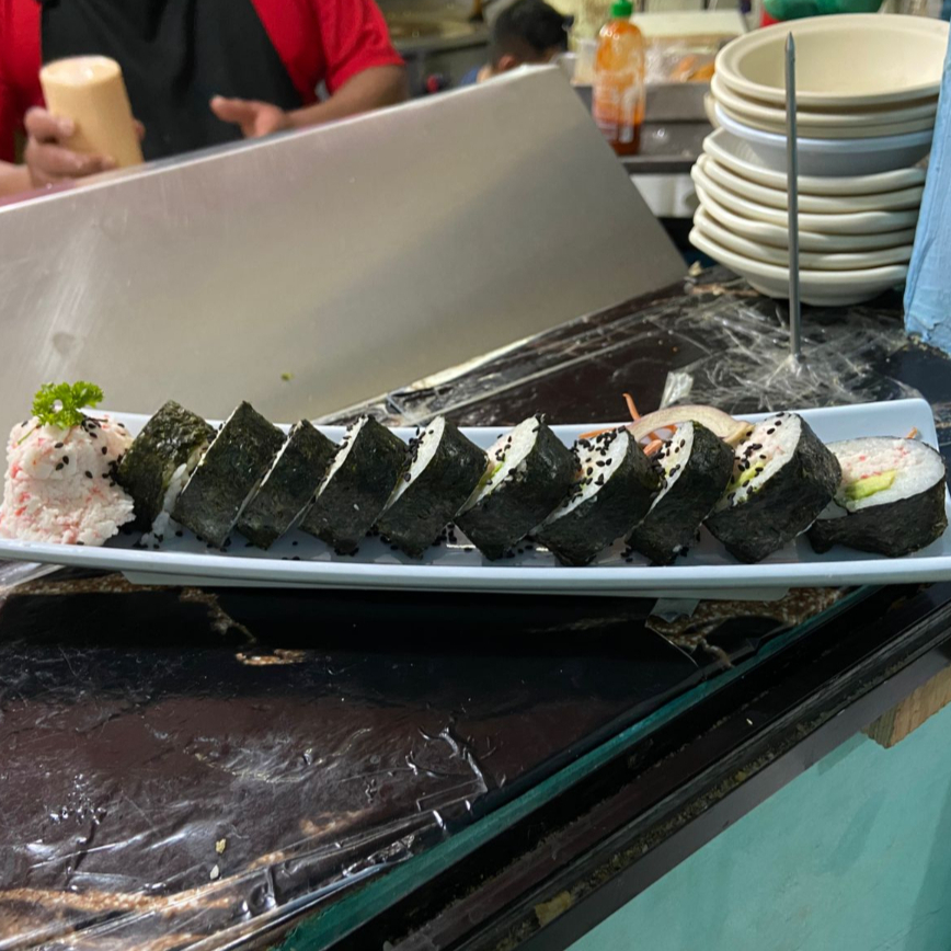 10 Piezas, aguacate, camarón, pepino queso, por fuera queso manchego con tampico a un lado.