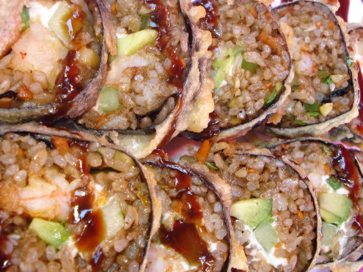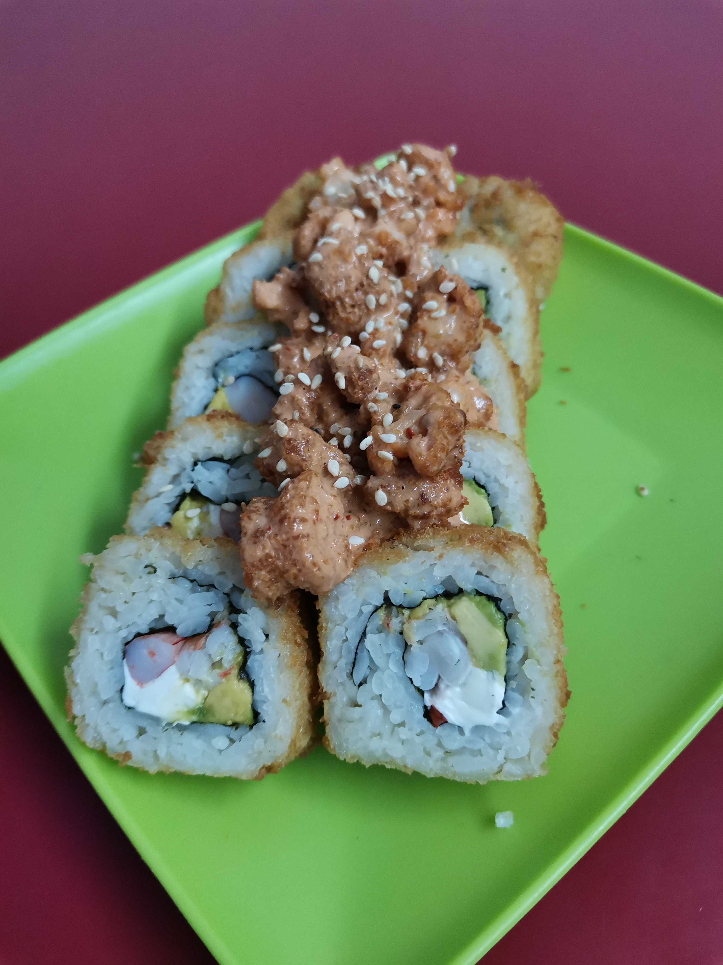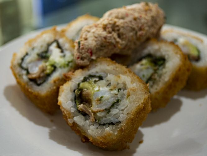 Rollo de sushi empanizado con camarón, queso crema, aguacate y camarón roca con chipotle arriba.