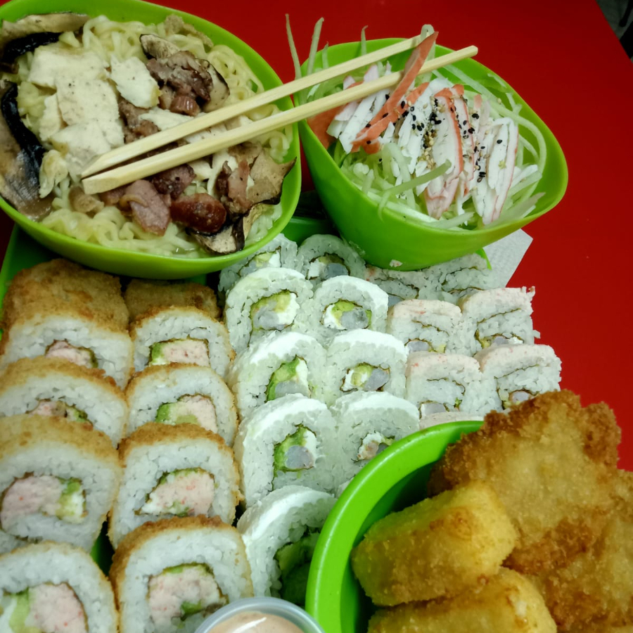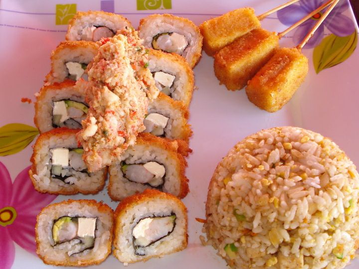 Cuatro rollos panki o filadelfia de pollo más su elección de tres complementos.