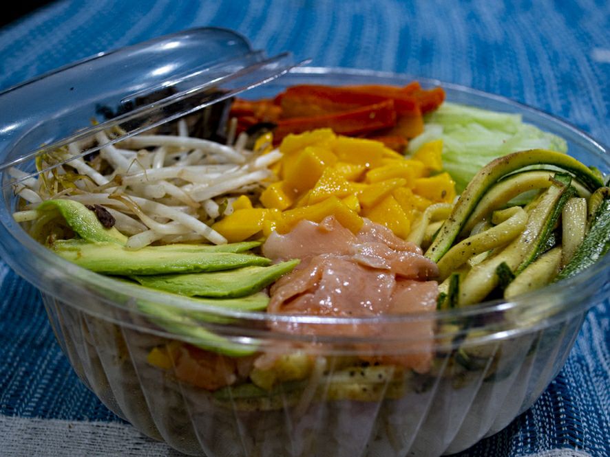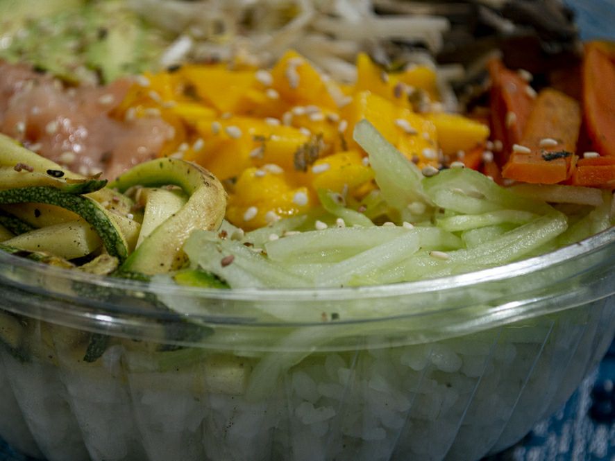 Base de arroz y/o fideos, 5 vegetales y/o frutas, 3 proteínas, furikake y ajonjolí.