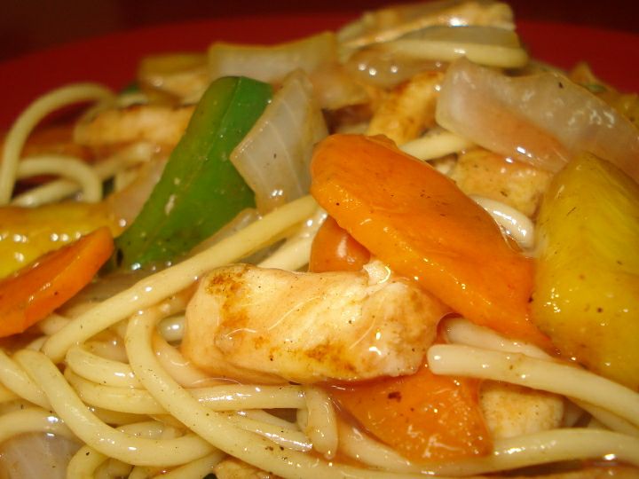 Pasta ramen salteada con pechuga pollo empanizada, tocino, piña en salsa agridulce.