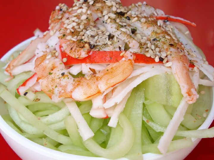 Pepino rallado, camaron y surimi.