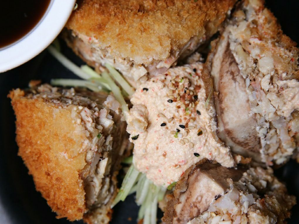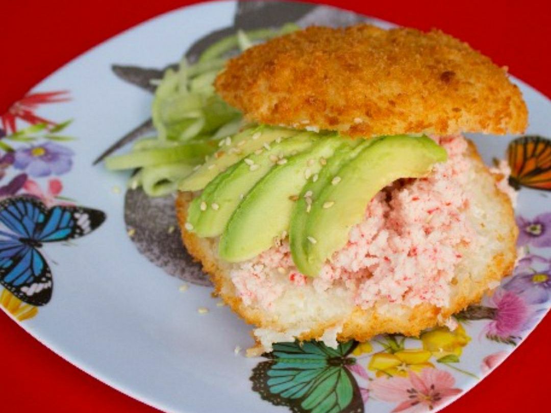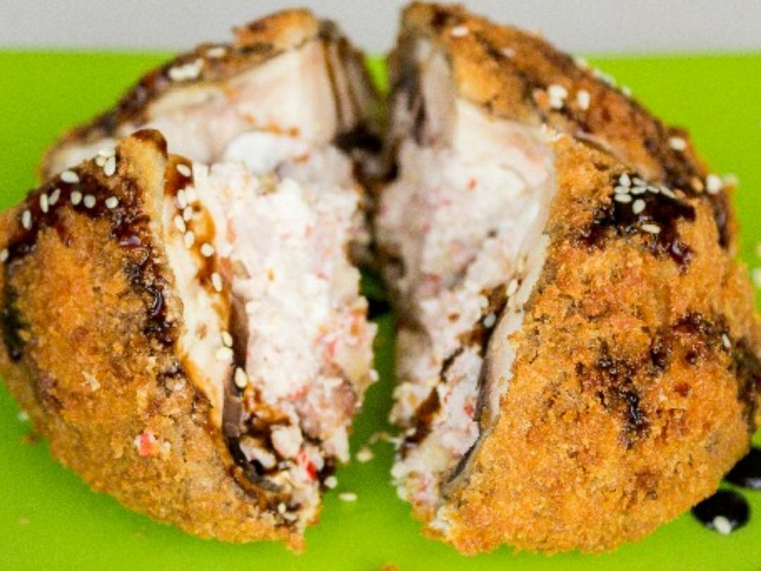 Hongo portobella o sushi burger empanizados rellenos con pastel de carne queso crema y pasta Tampico