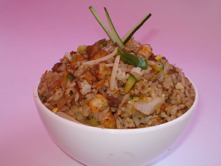 Arroz frito con ingrediente a elección, guisado con verdura, mantequilla, salsa de soya, ajo, pimienta y germen de soya fresco.
