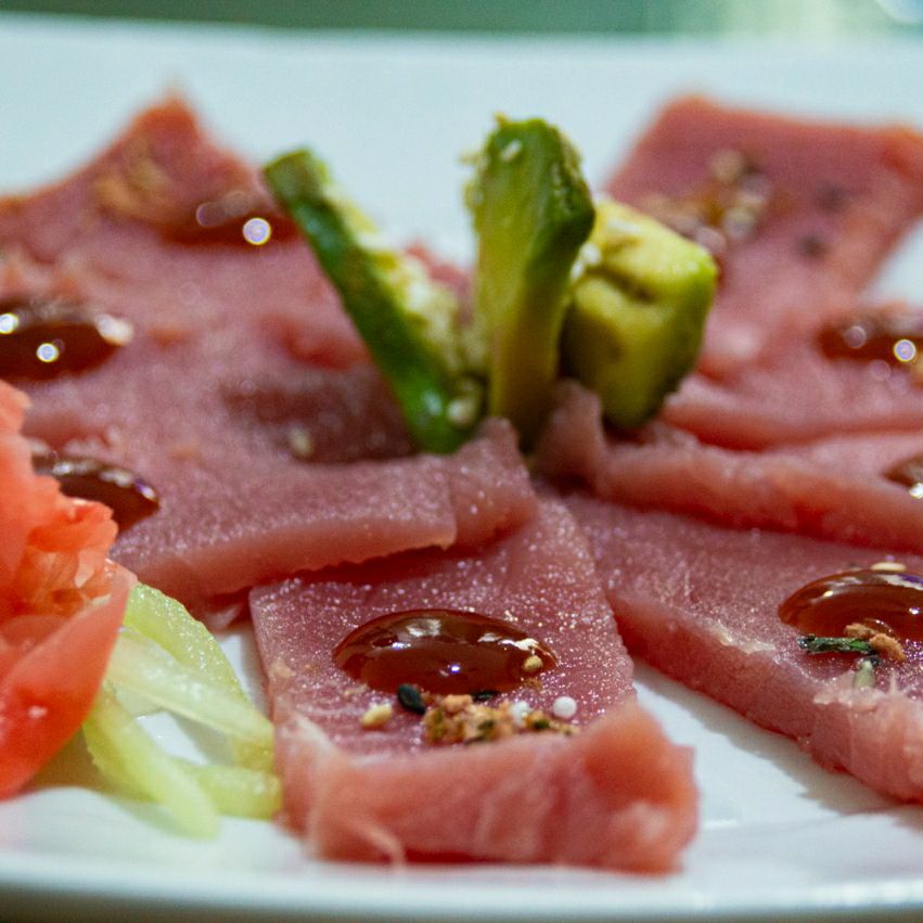 Atún fresco sellado, fill natural o rasurado y marinado.