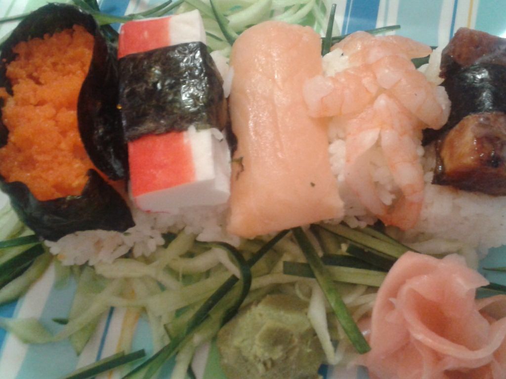Pepino rallado, surimi, camarón, zanahoria rallada, mango, germen, piña y furicake.