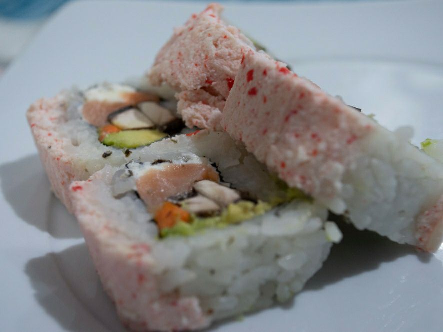 Hoja de surimi afuera, tampico, queso crema, aguacate y salmón.