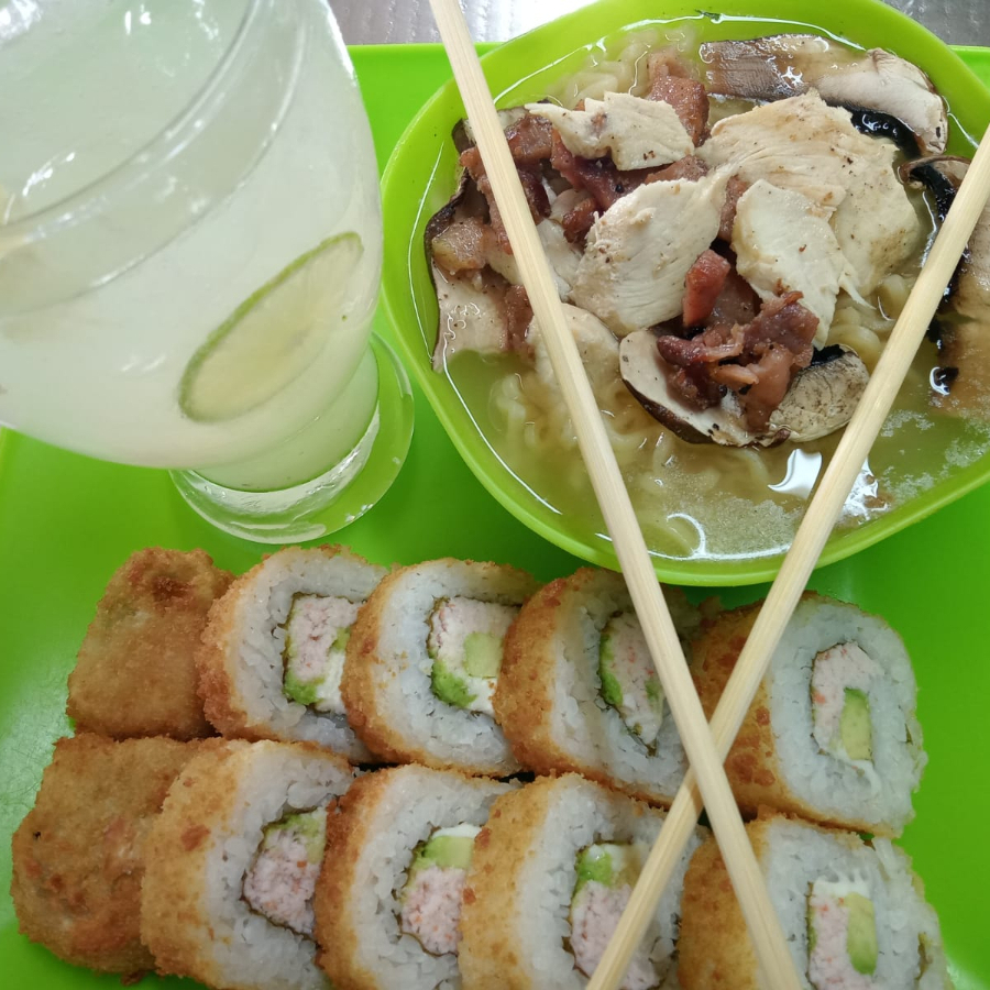 Deliciosa sopa Ramen (1/2 litro) y sushirollo de tu elección fresco o empanizado (10 bocados) y kyuri refresher (bebida pepino, piña y limón 16 oz).