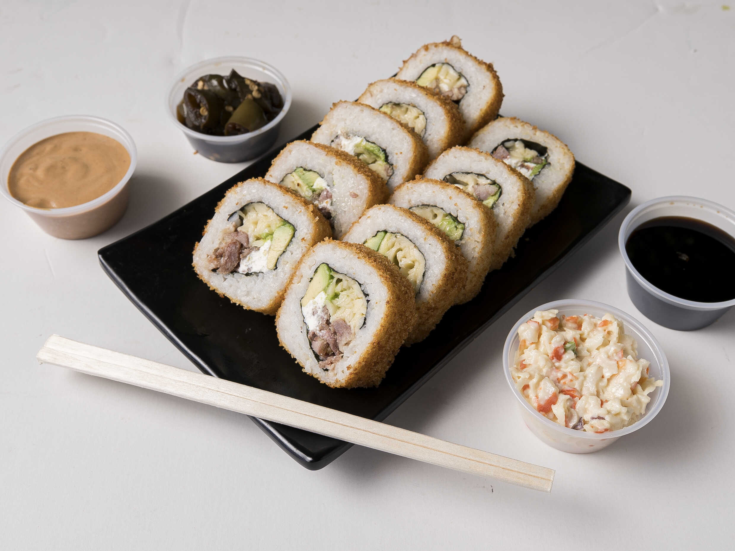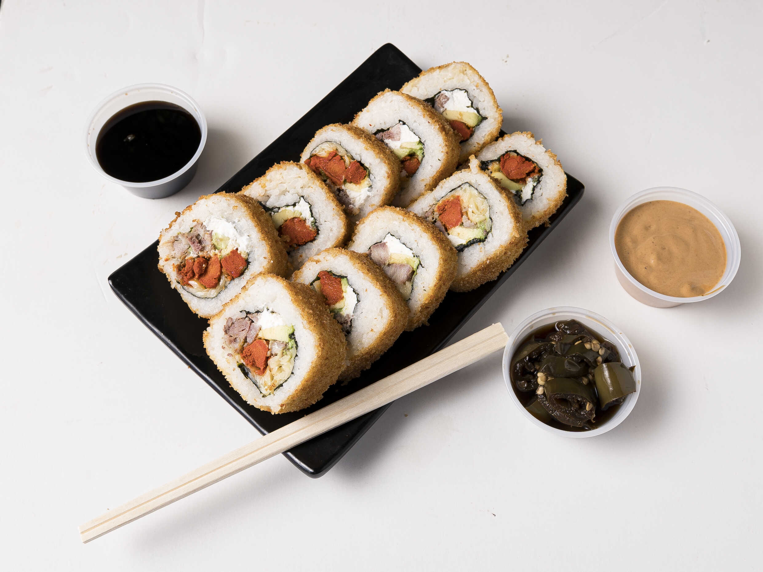 Rollo empanizado con flaming hot relleno con queso crema, queso manchego y queso americano. Incluye 1 salsa de soya y 1 salsa chipotle cremoso.