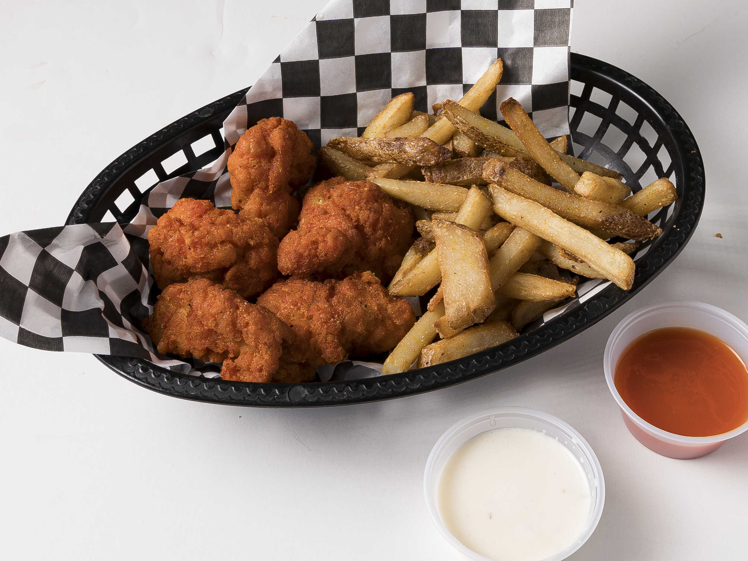 300g de boneles bañados en la salsa de tu elección ya sea bufalo bbq o mango habanero, acompañadas con papas bañadas en queso y chips de tocino Nota: escribir tu preparación en comentarios