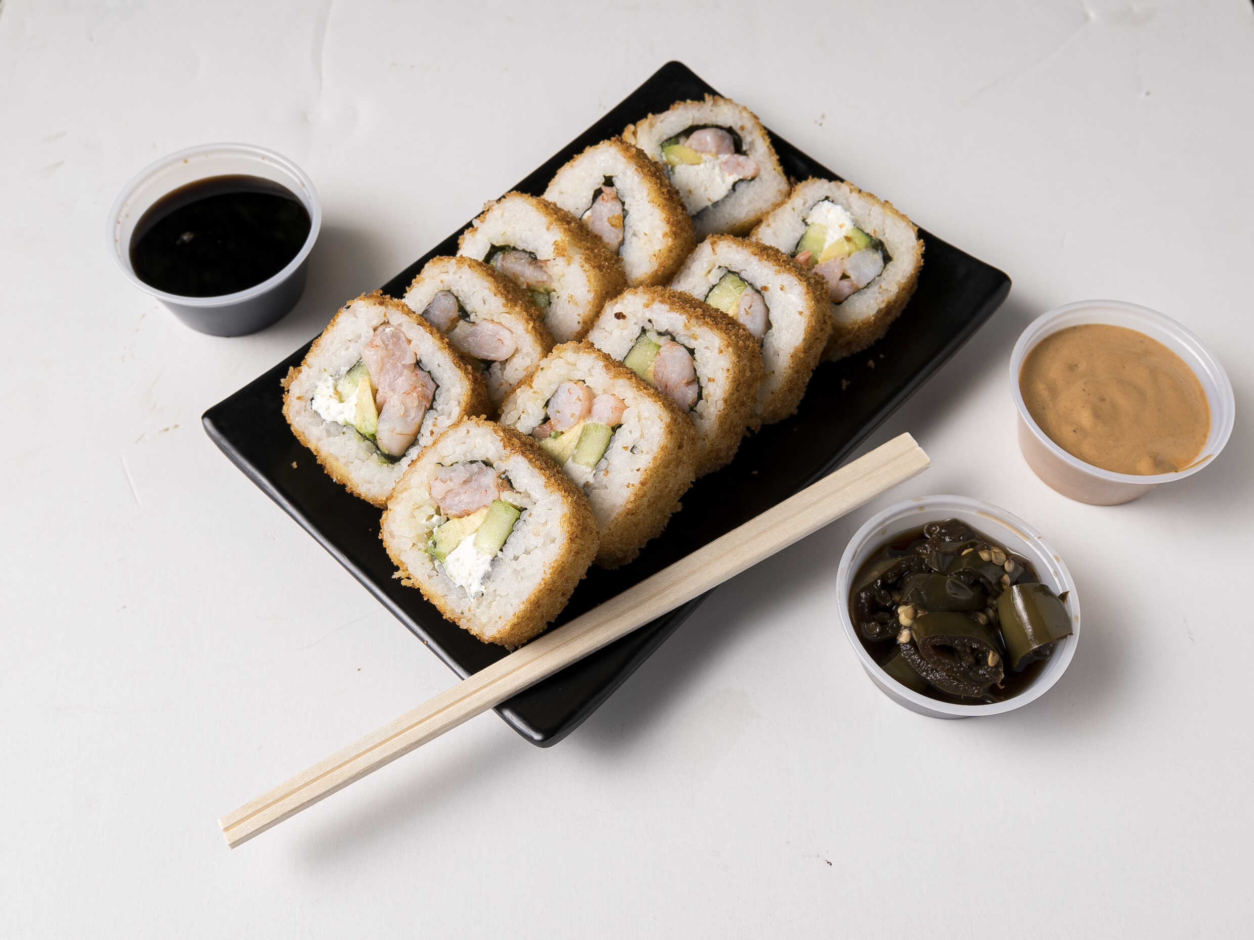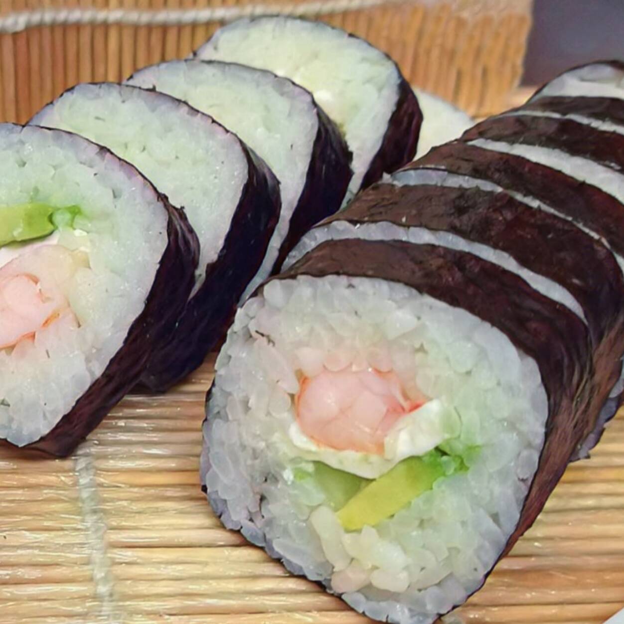 Enrollado en alga nori por fuera, por dentro queso crema, aguacate, pepino y camarón