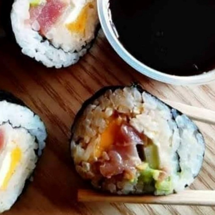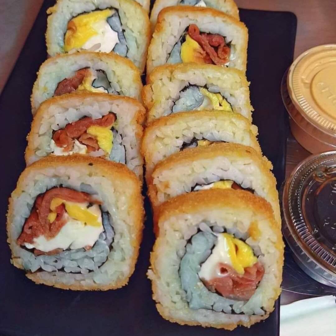 Enrollado con alga nori por fuera, por dentro queso crema, atún fresco aguacate y mango