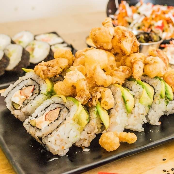 Base de arróz blanco con camarón Tampico aguacate queso crema y ajonjolí