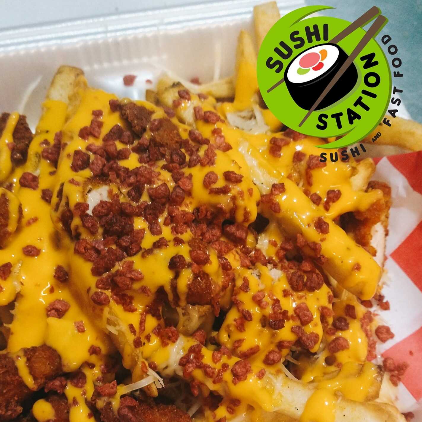 Papas fritas preparadas con queso manchego rallado, queso amarillo, trocitos de boneles y chips de tocino